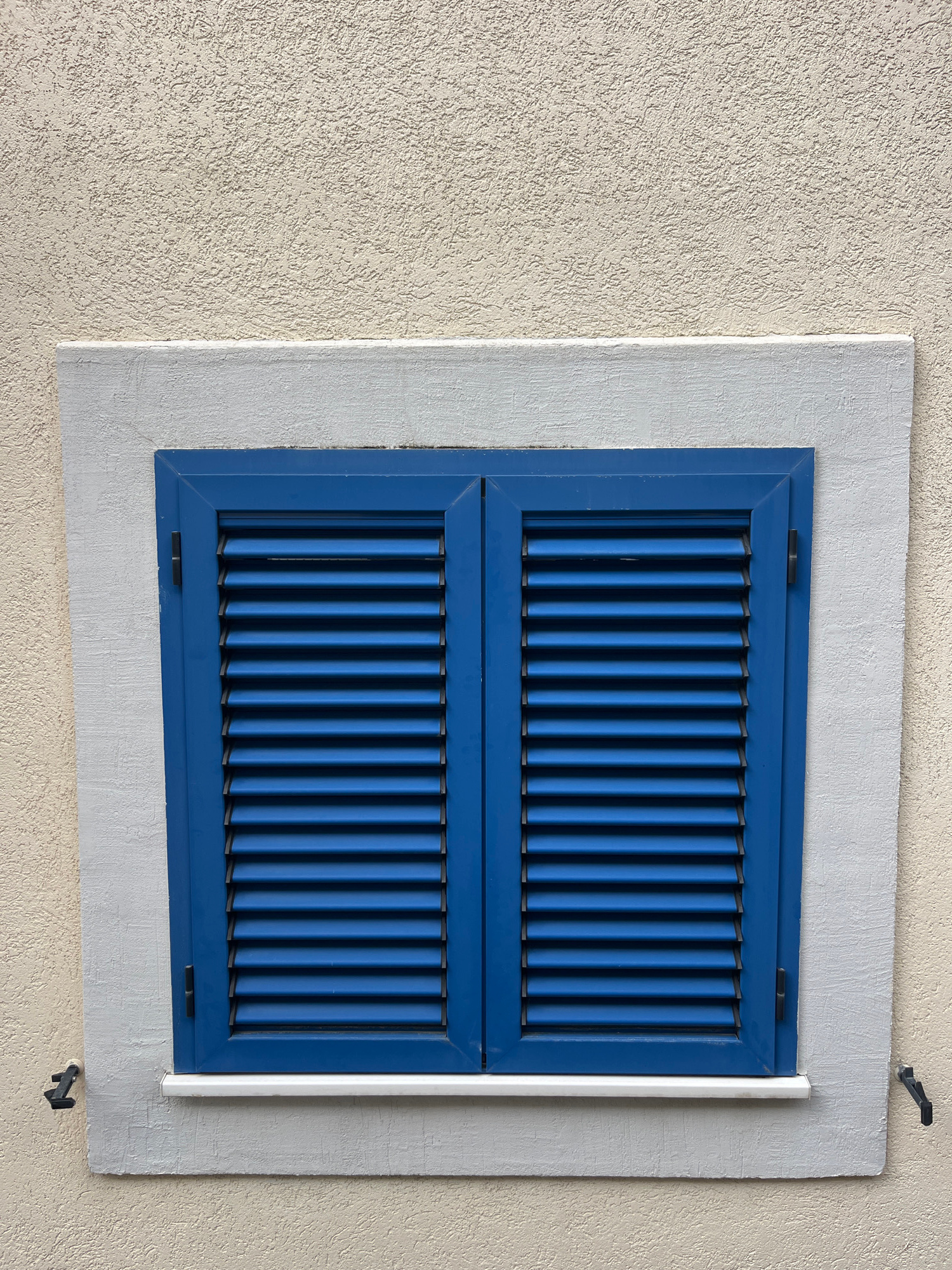A window with blue louvered shutters is set in a light gray surround, framed by a beige stucco wall. The location is Bečići, Montenegro. A white pipe runs vertically along the right side of the window…read more