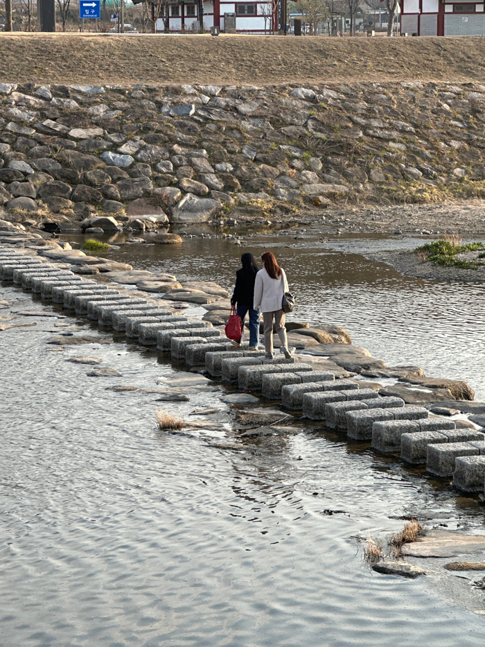The image depicts a daytime scene at the Muncheon River in Gyeongju-si, South Korea. Two individuals are observed from behind, walking from left to right across a stepping stone bridge composed of reg…read more
