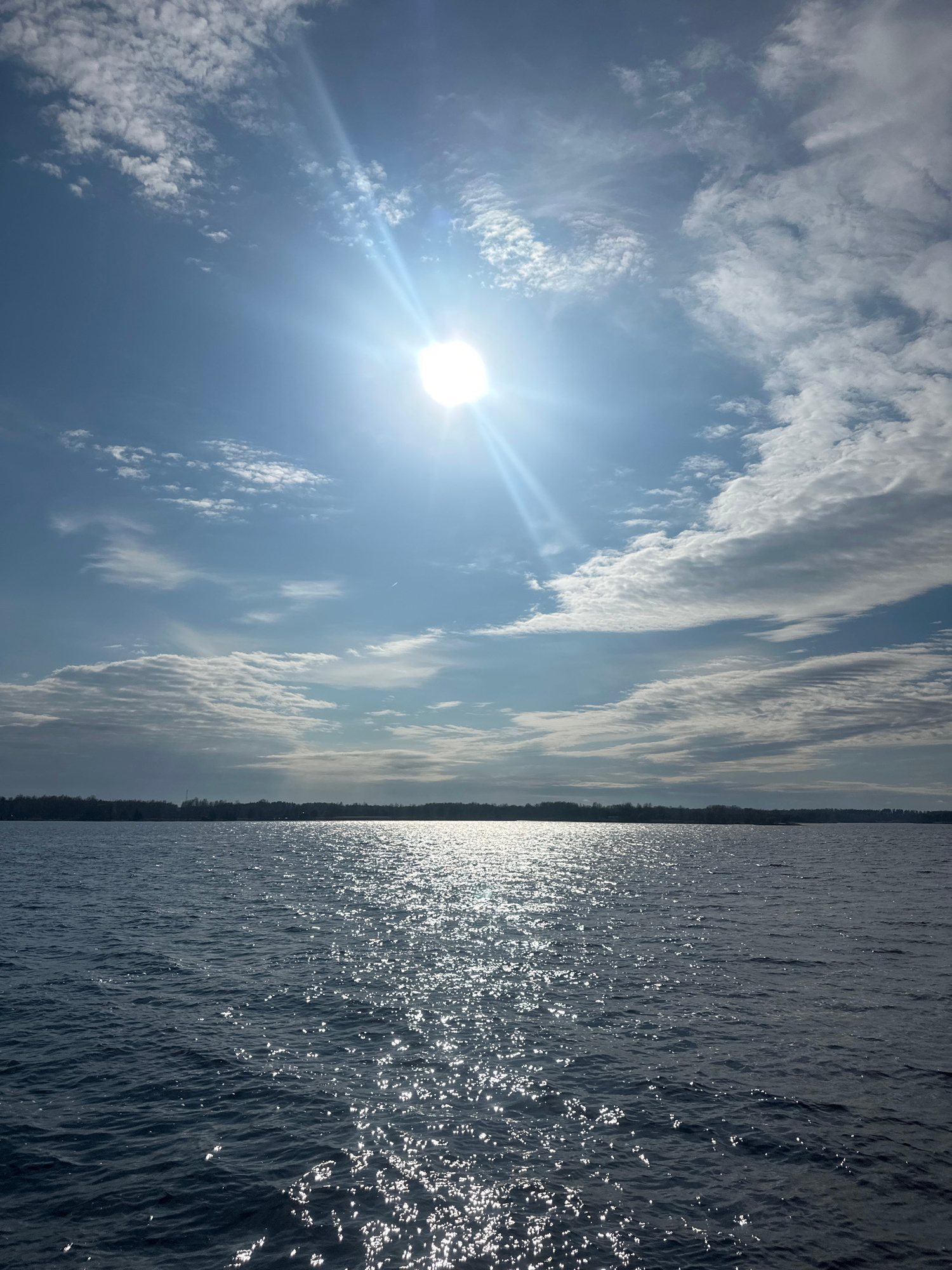The image captures a bright, expansive outdoor scene, divided horizontally between sky and water by a distant treeline. The upper two-thirds of the frame display a vibrant blue sky dotted with scatter…read more