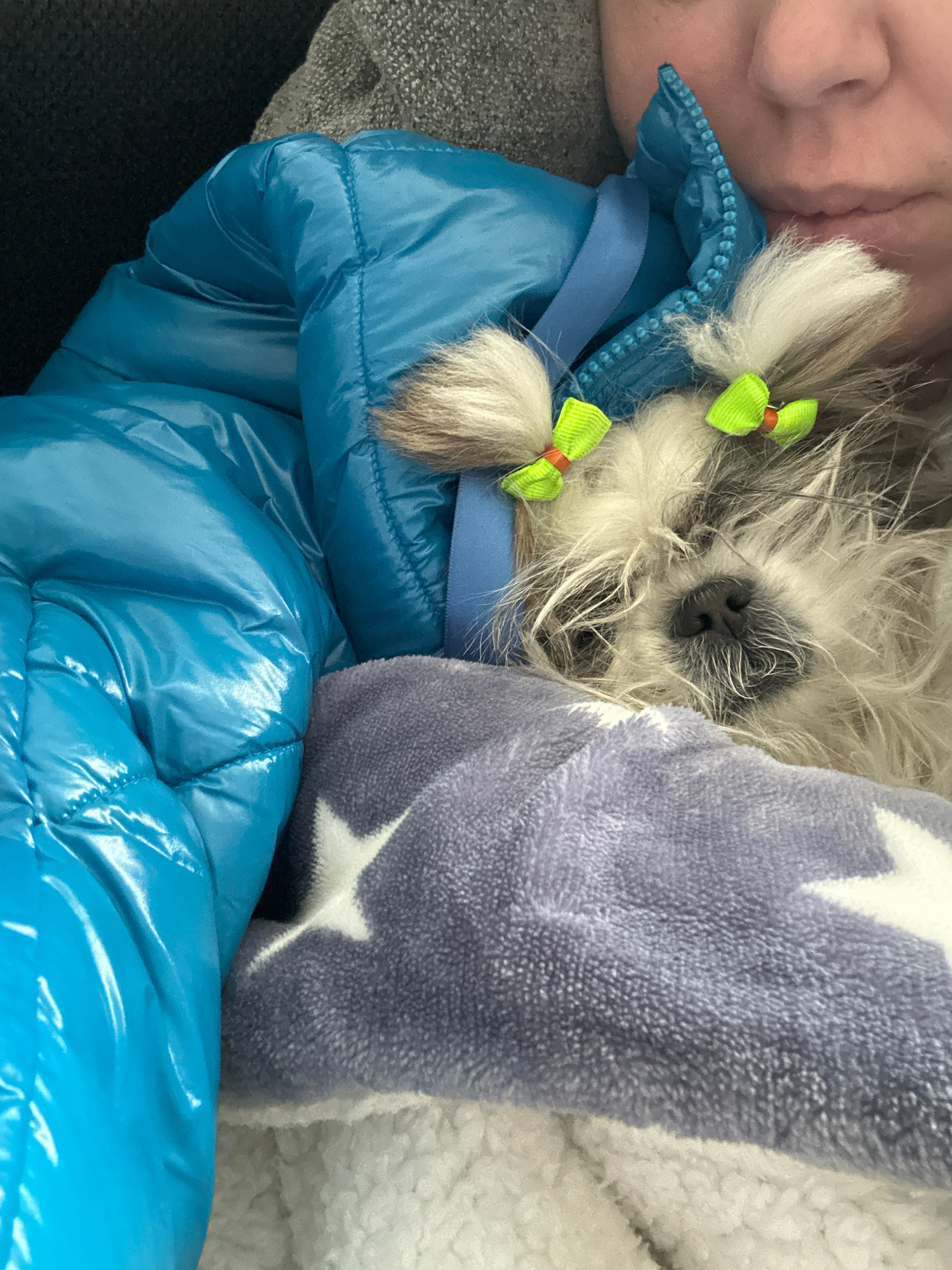 This close-up, high-angle shot captures a cozy and intimate scene featuring a small dog nestled comfortably indoors. The main subject is a shaggy-haired dog with light grey and white fur, prominently…read more