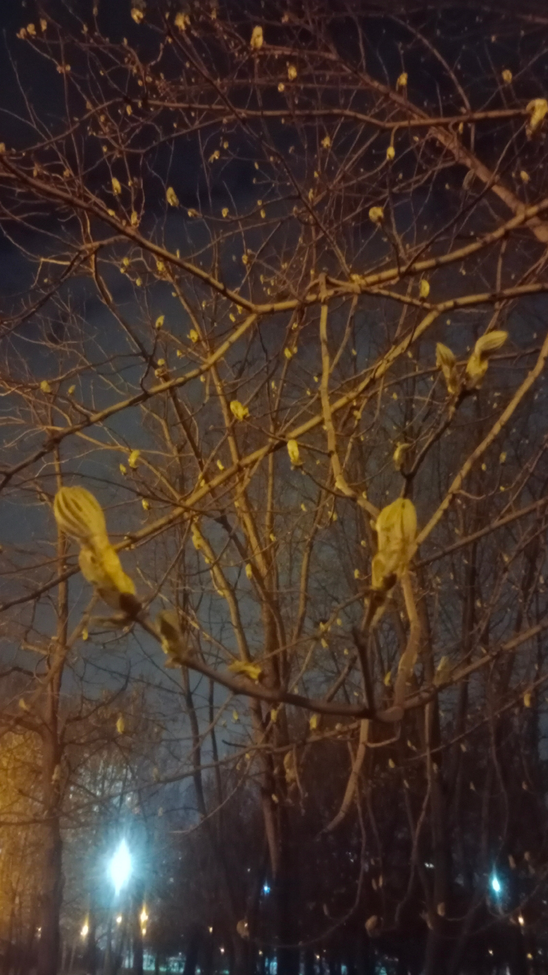 The image portrays a tranquil night scene in a park, likely in Moscow, Russia. The foreground is filled with a dense network of tree branches, largely bare but conspicuously dotted with numerous small…read more