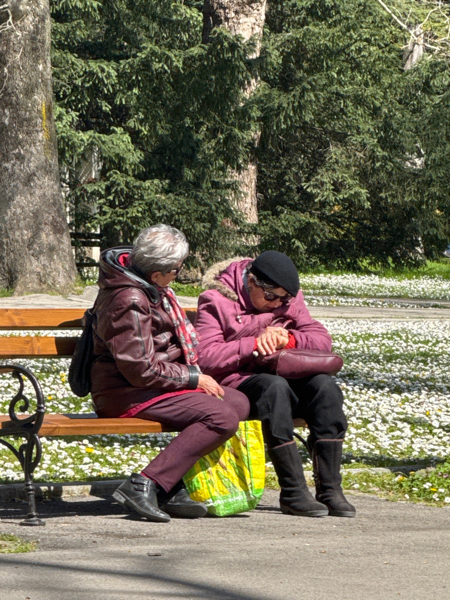 This image, captured in Varna, Bulgaria, shows two individuals, likely women, seated on a wooden park bench on a sunny day. The setting is an outdoor park or garden, characterized by a wide expanse of…read more