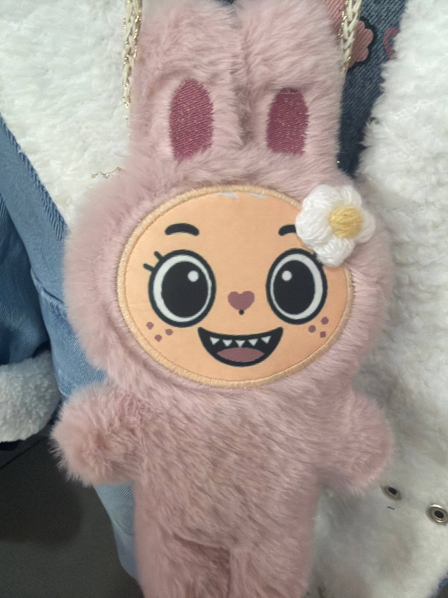 A brightly lit, close-up shot captures a plush, pink, faux-fur item laid horizontally across the frame. This item features a large, circular, light peach-colored appliqué of a cartoon character's face…read more