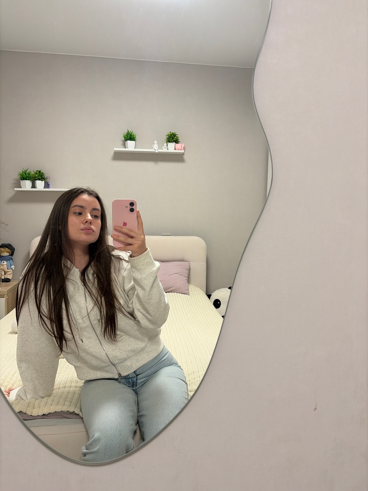 A young woman with long brown hair is taking a selfie in a mirror inside a bedroom. She is wearing a light grey hooded sweatshirt and light blue jeans. She is holding a pink iPhone. The room contains…read more