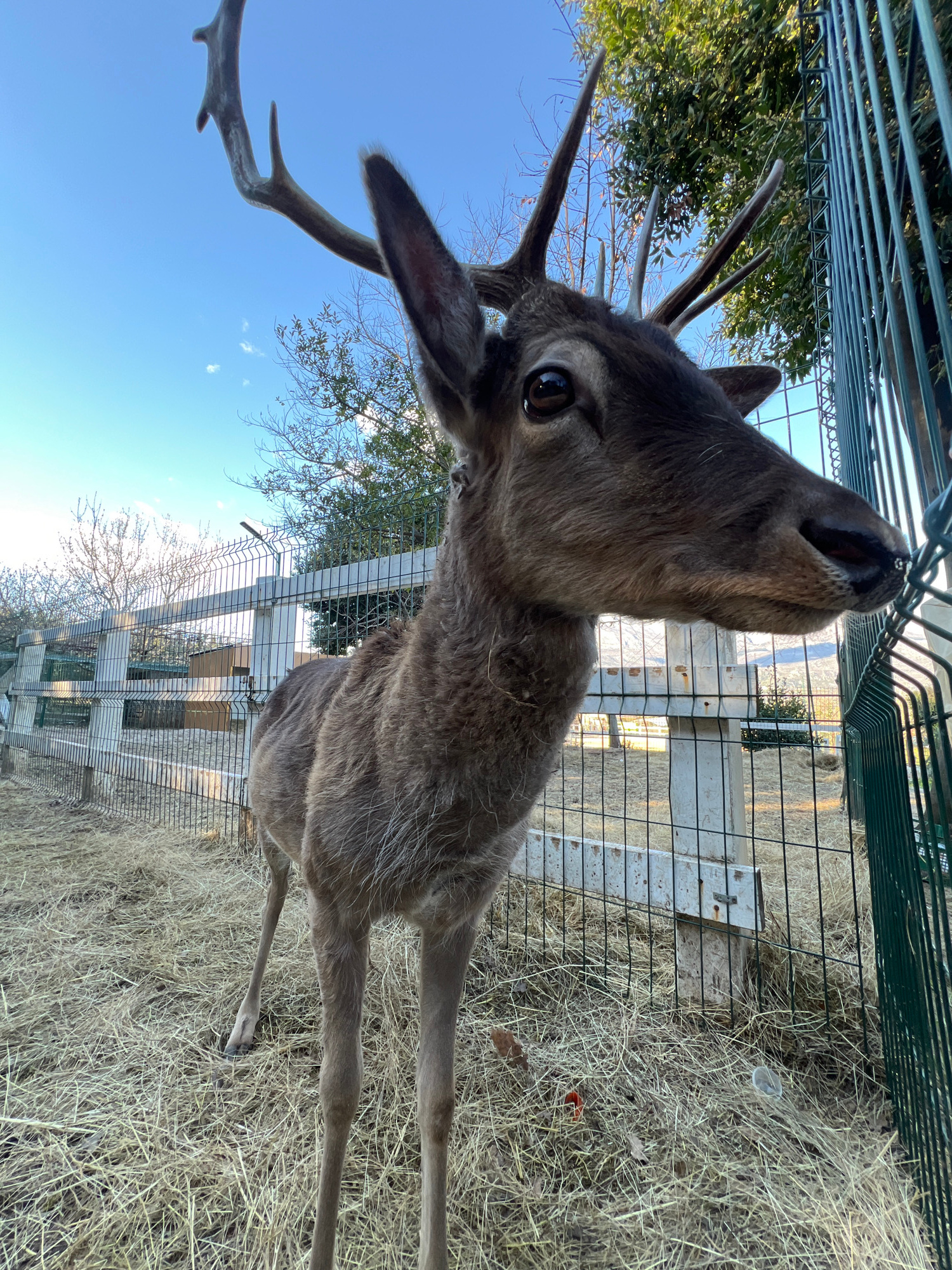 A deer stands within a wire fence enclosure, positioned on a layer of dry grass or hay. The deer has antlers and looks upward towards the top of the fence. Behind the fence, a secondary fence and some…read more