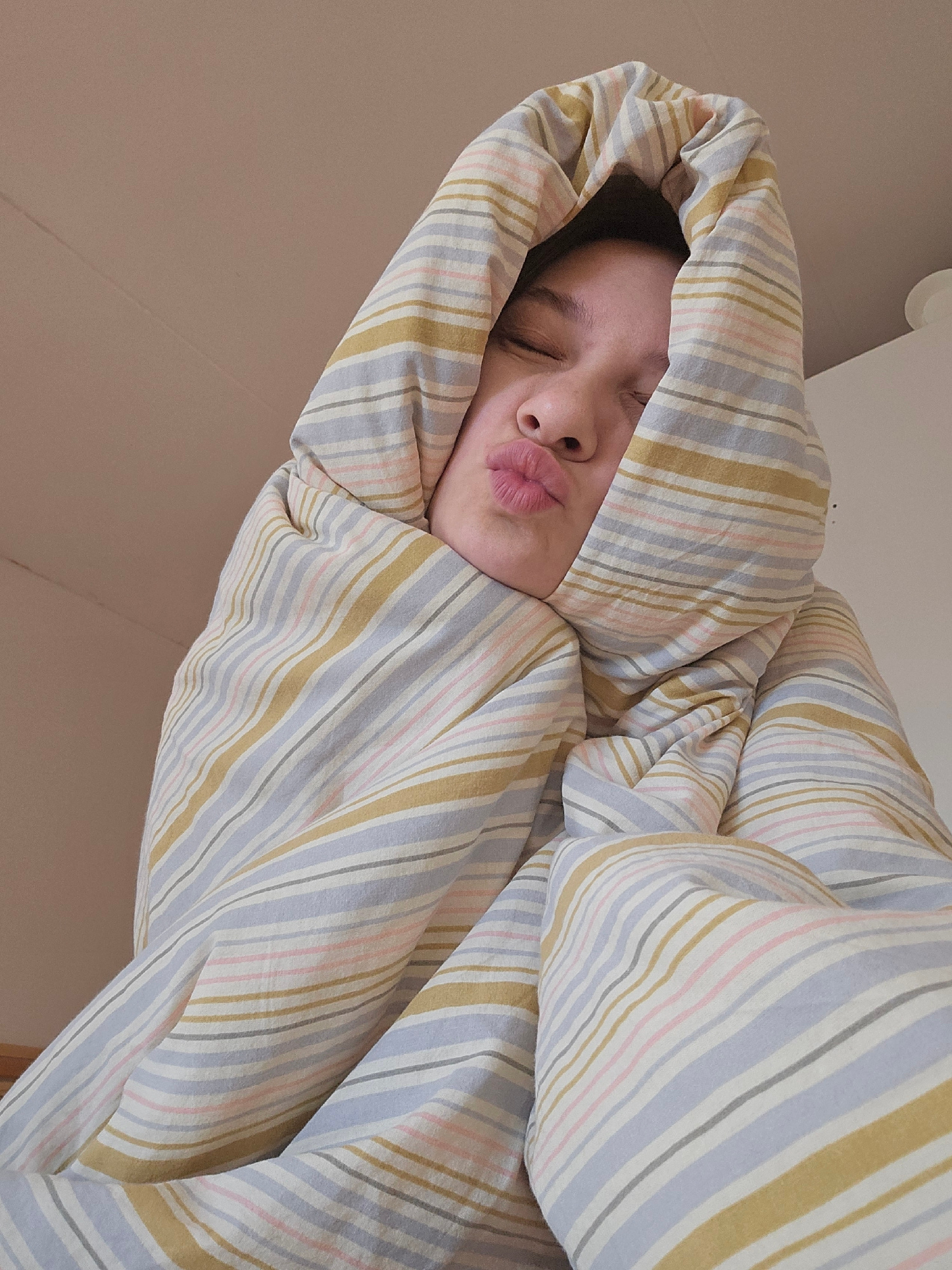 The image depicts a person lying down, covered in a striped blanket with their eyes closed and lips puckered in a kiss. The blanket is predominantly striped with colors of gold, grey, pink, and white.…read more