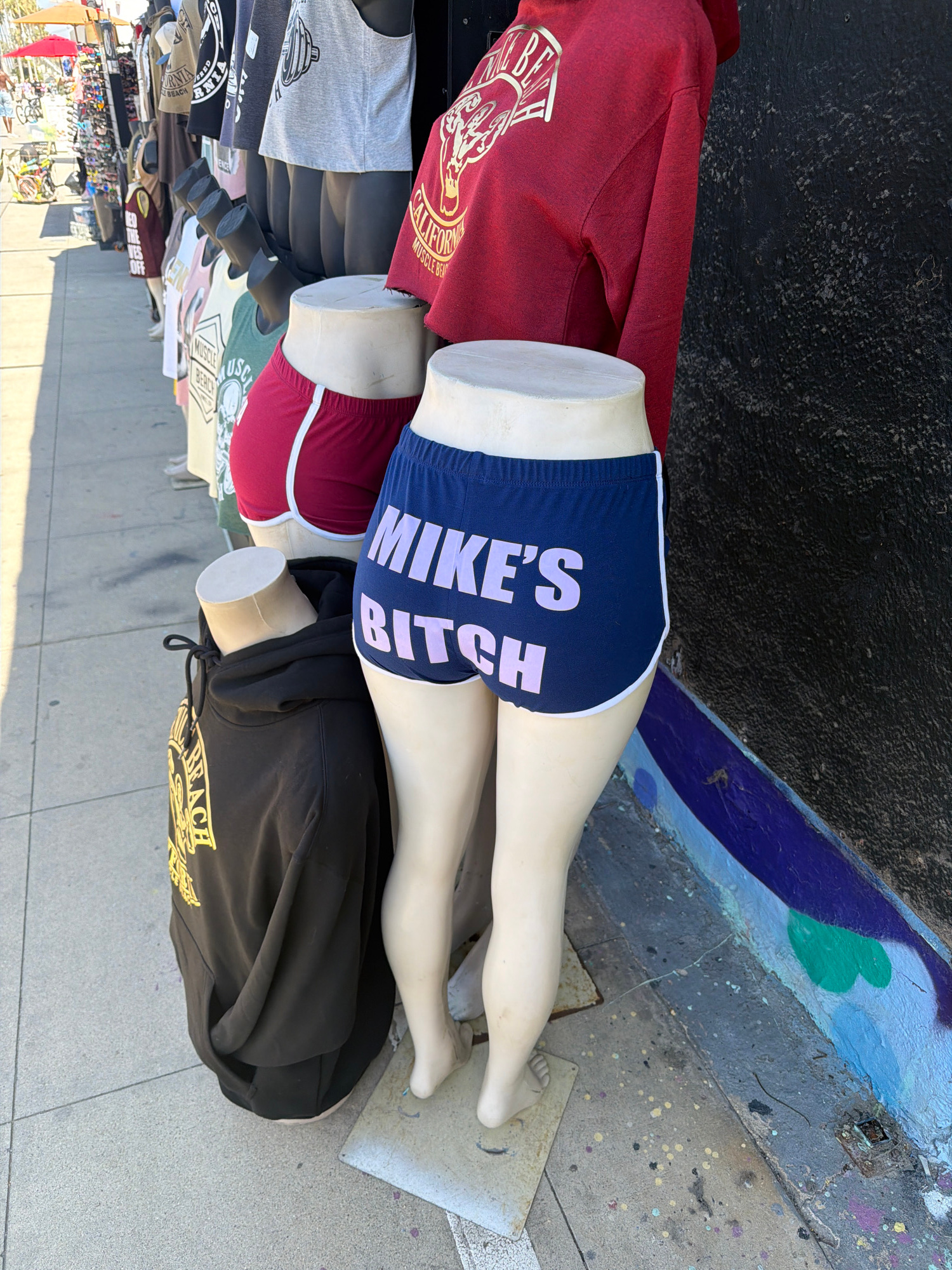 This image captures a portion of an outdoor clothing display, likely at a street stall or market in Los Angeles, USA. The primary subjects are several headless mannequins and torsos adorned with vario…read more