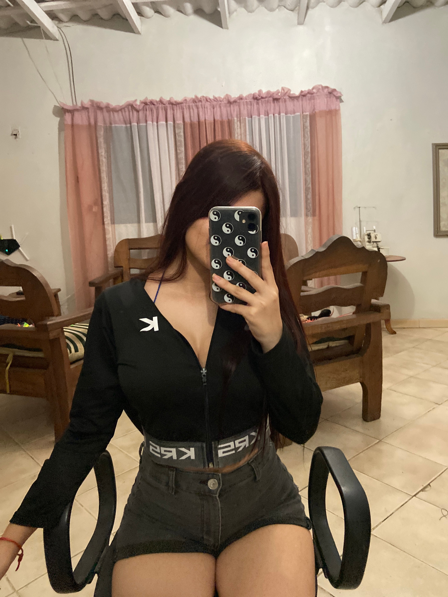A person is taking a selfie in what appears to be a bedroom or living room. The person is holding a smartphone with a case that has yin-yang symbols printed on it. The person is wearing a black long-s…read more
