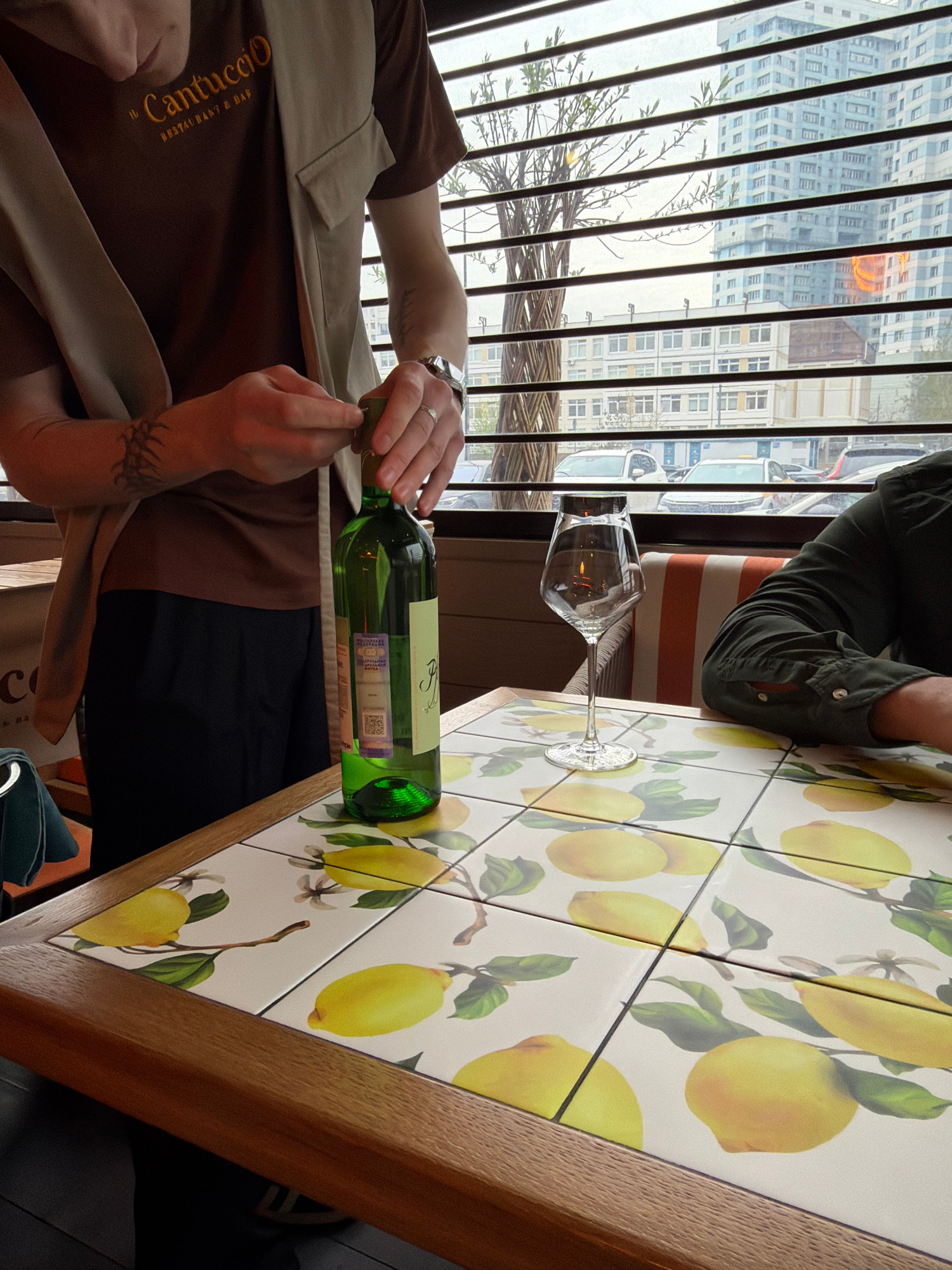 The image depicts a scene at a restaurant, likely in the city of Khimki, Russia, indicated by the "Cantuccio Restaraunt & Bar" inscription on a person's shirt. The setting is indoors, with a view of b…read more