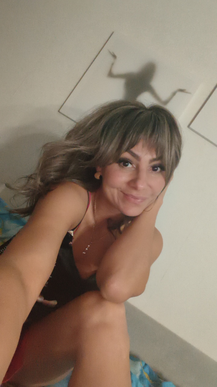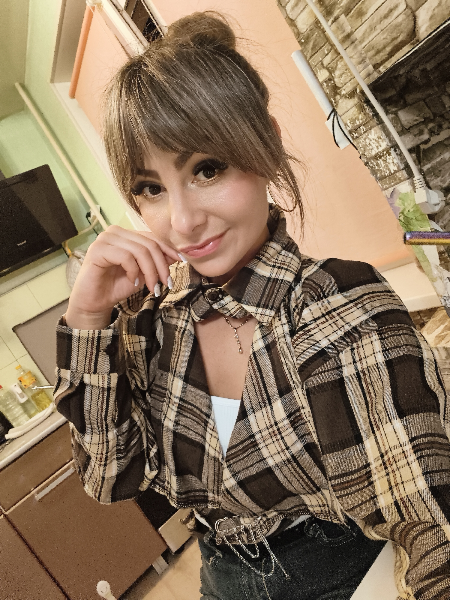 A woman is posing for a selfie indoors. She has brown hair pulled back in a messy bun with bangs, brown eyes, and wears makeup including mascara and eyeliner. She is wearing a brown and beige plaid sh…read more
