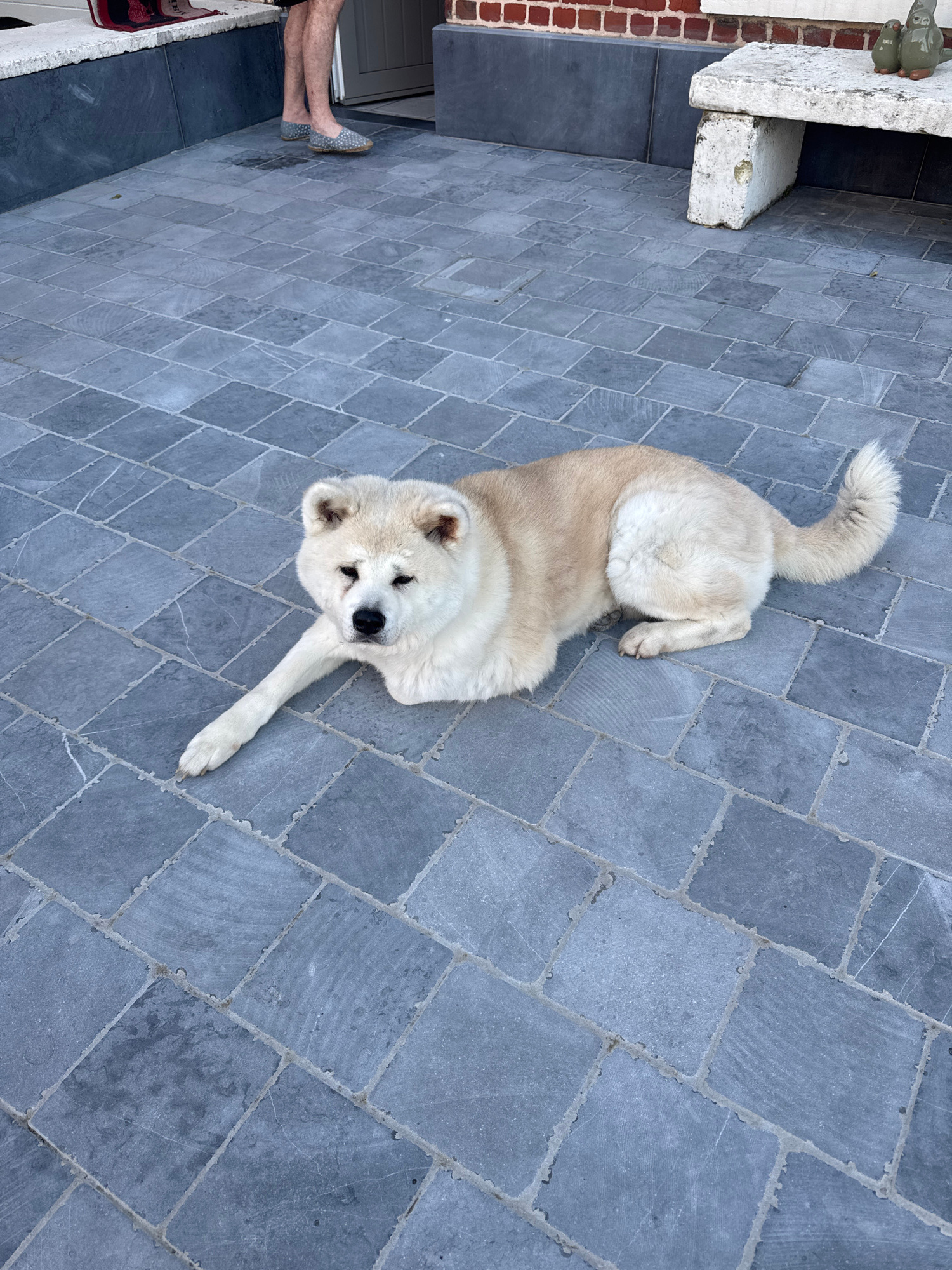 A cream-colored dog is lying on a gray stone-tiled surface. The dog is positioned diagonally in the frame, with its head near the center and its tail towards the top left. A person's feet and lower le…read more
