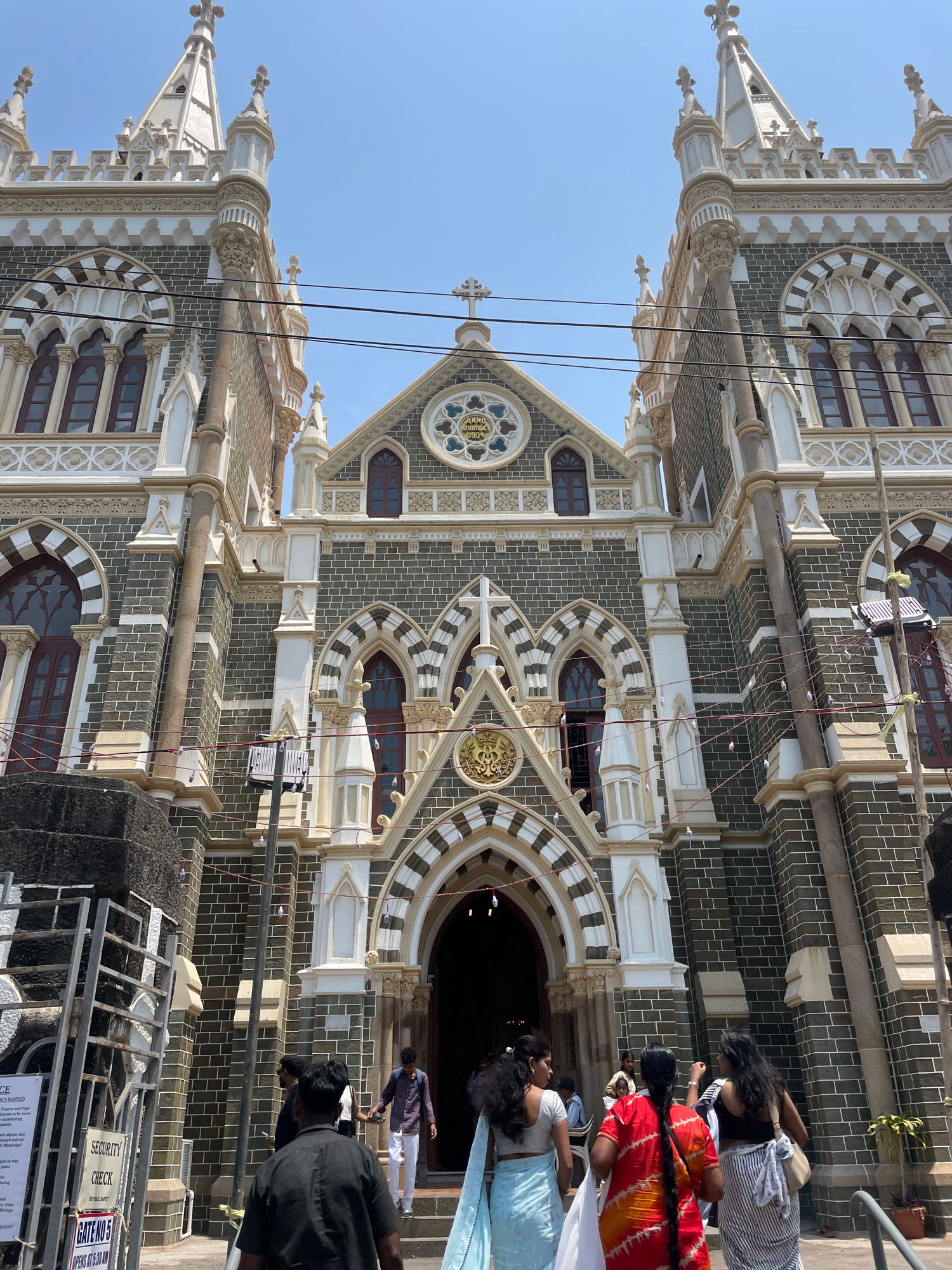 The image shows the facade of the Mount Mary Church in Mumbai, India. The architecture is Gothic Revival, featuring gray brickwork with white ornamentation and arched windows. A group of people are e…read more