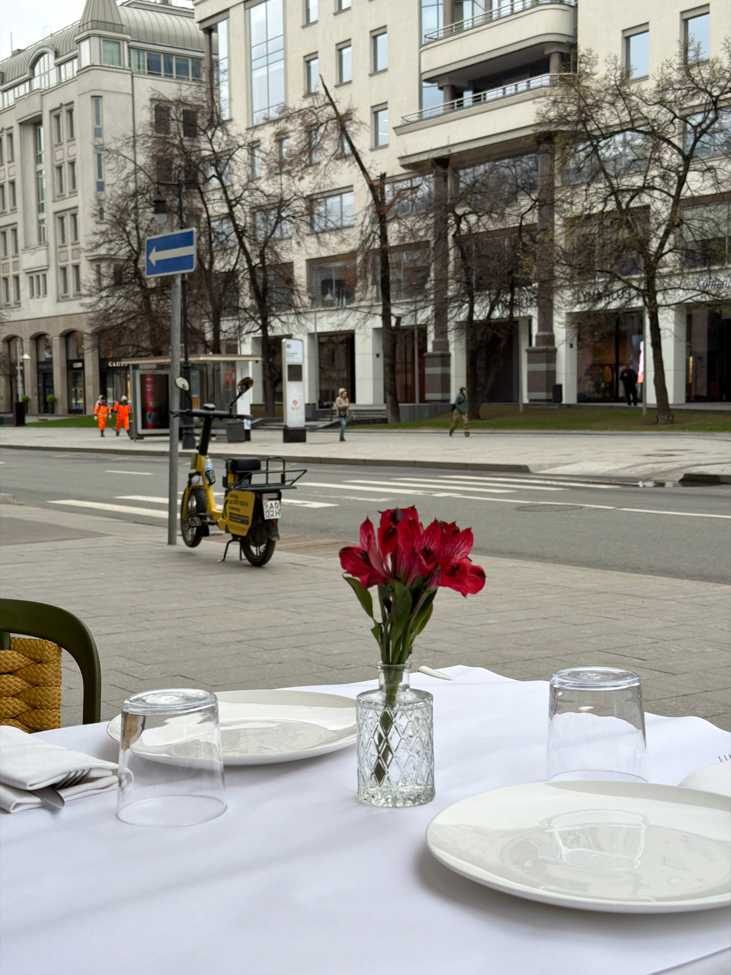 The image captures an outdoor dining scene in what appears to be a European city. A table is set with white linens, plates, glasses, silverware, and a vase of red flowers. A white building is visible…read more
