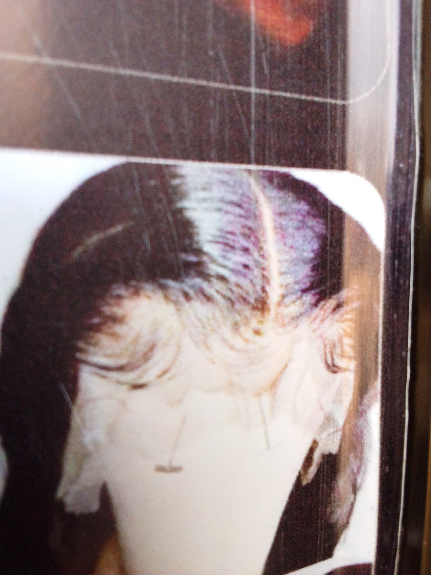 The image shows a close-up of a photograph or printed image of the back of a person's head and shoulders. The person has dark hair with a visible parting at the crown. The skin appears light in color,…read more
