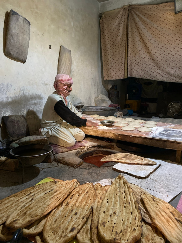 An individual, wearing light clothing and a head covering, is seated beside a wall-mounted oven. The person appears to be pressing dough circles onto the oven's surface. Stacked flatbreads lean agains…read more