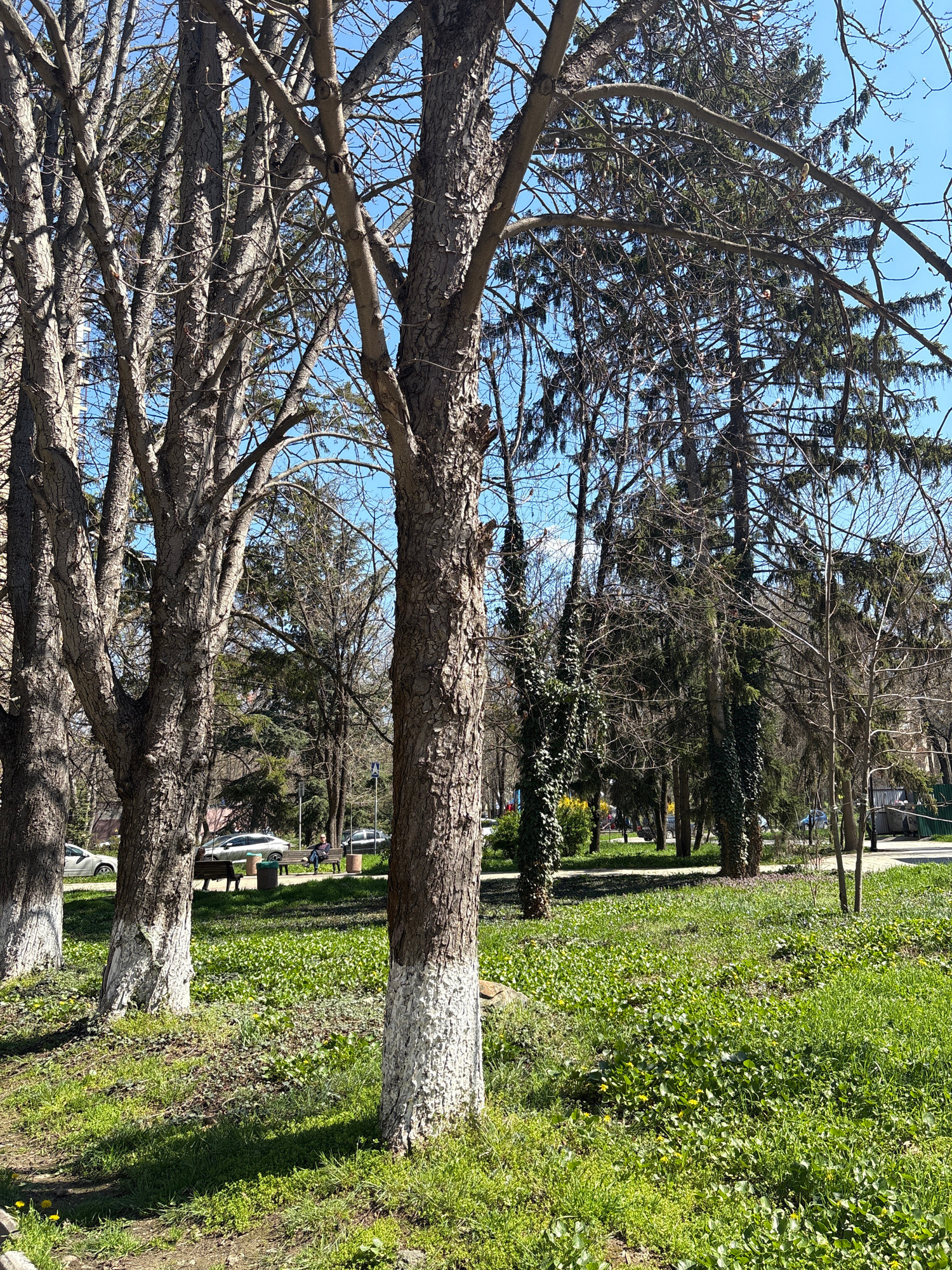 The image depicts a street scene with trees in the foreground and background. The foreground features several bare deciduous trees with thick, textured bark. Some of the tree trunks are painted white…read more