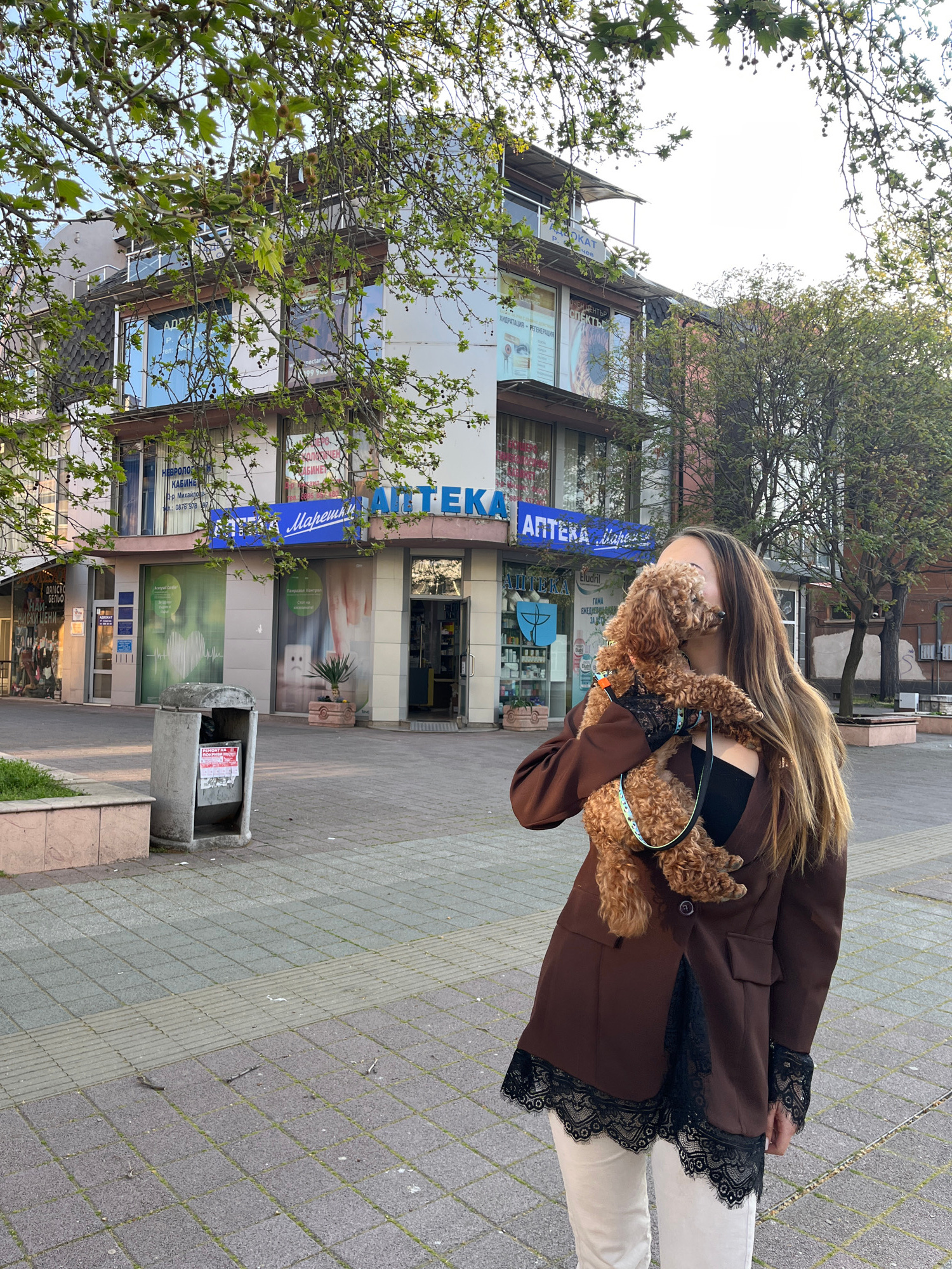A woman stands on a paved sidewalk, holding a poodle. She is wearing a brown blazer with black lace trim, a black top, and white pants. In the background is a building with the word "АПТЕКА" displayed…read more