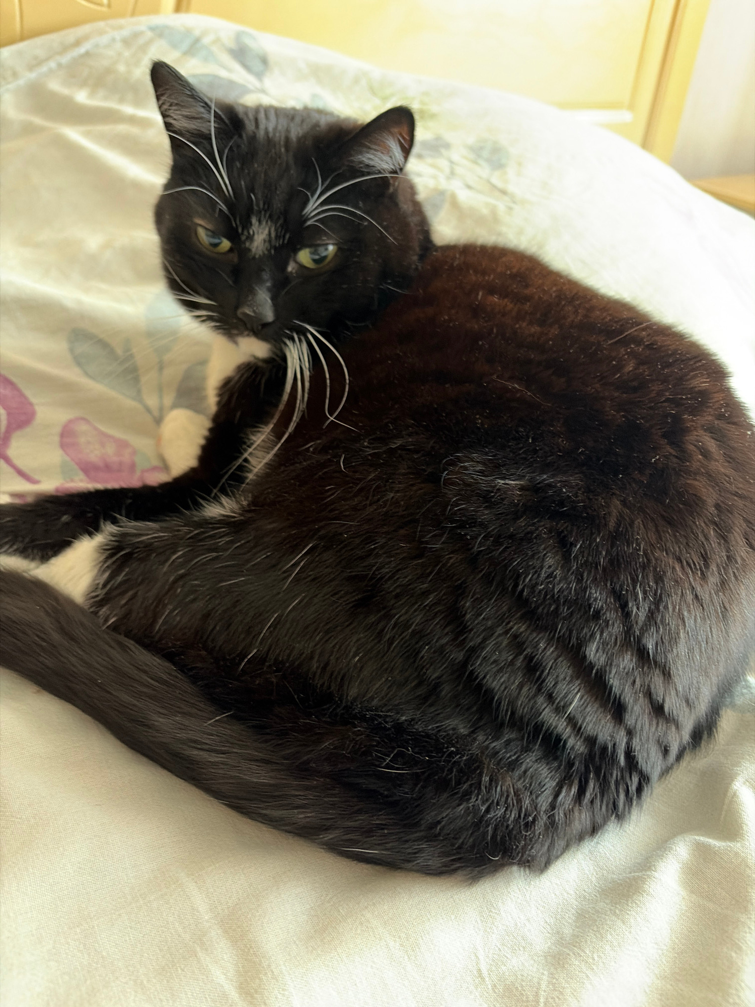 A black and white tuxedo cat is curled up on a light-colored floral patterned bedspread. The cat's head is tilted towards the viewer, with visible white whiskers and yellow-green eyes. The background…read more