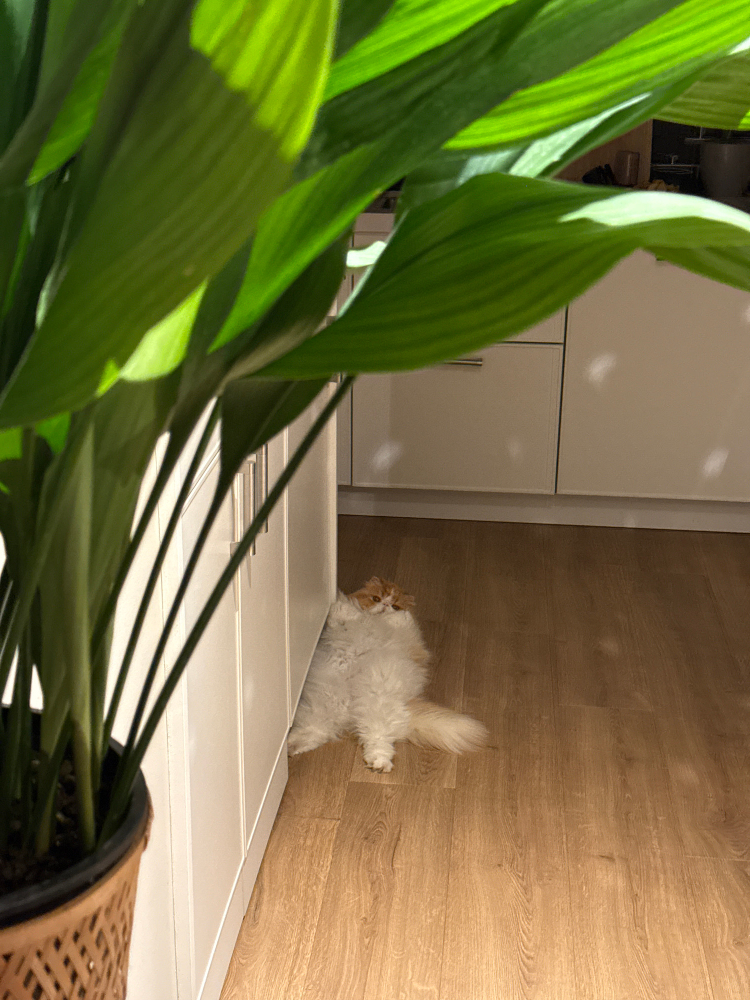 The image shows a long-haired cat lying on a wooden floor, adjacent to a white cabinet. A potted plant with green leaves is in the foreground, partially obscuring the view. The location is unknown andβ¦read more