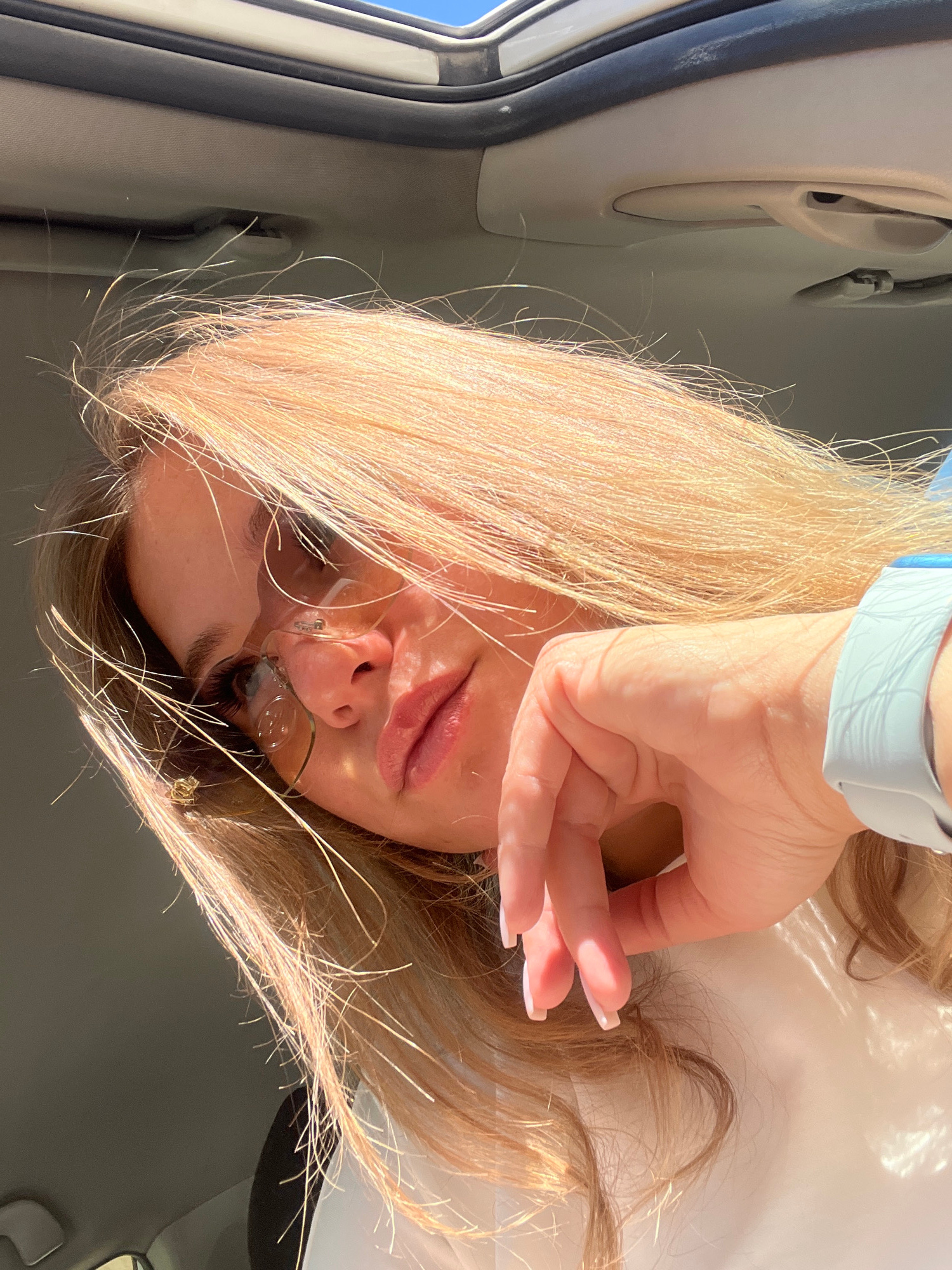 The image shows a person with blonde hair and glasses, positioned upside down within what appears to be the interior of a vehicle. The person is wearing a light-colored wristband, and their hand is pa…read more