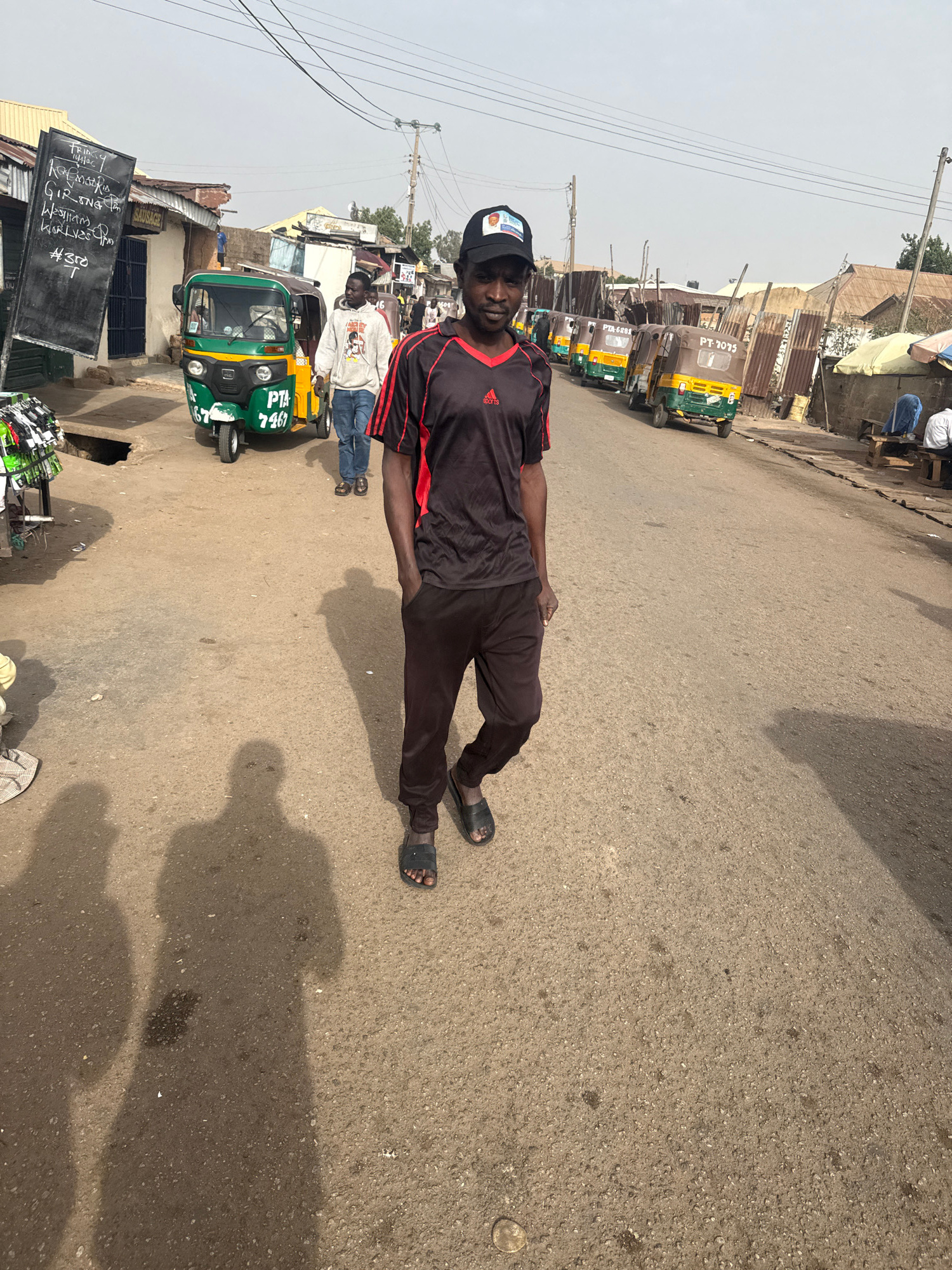 The photo shows a man standing in a street in Jos, Nigeria. He is wearing a black and red shirt, dark pants, and black sandals. He also wears a black cap with an image on it. Several auto rickshaws (…read more