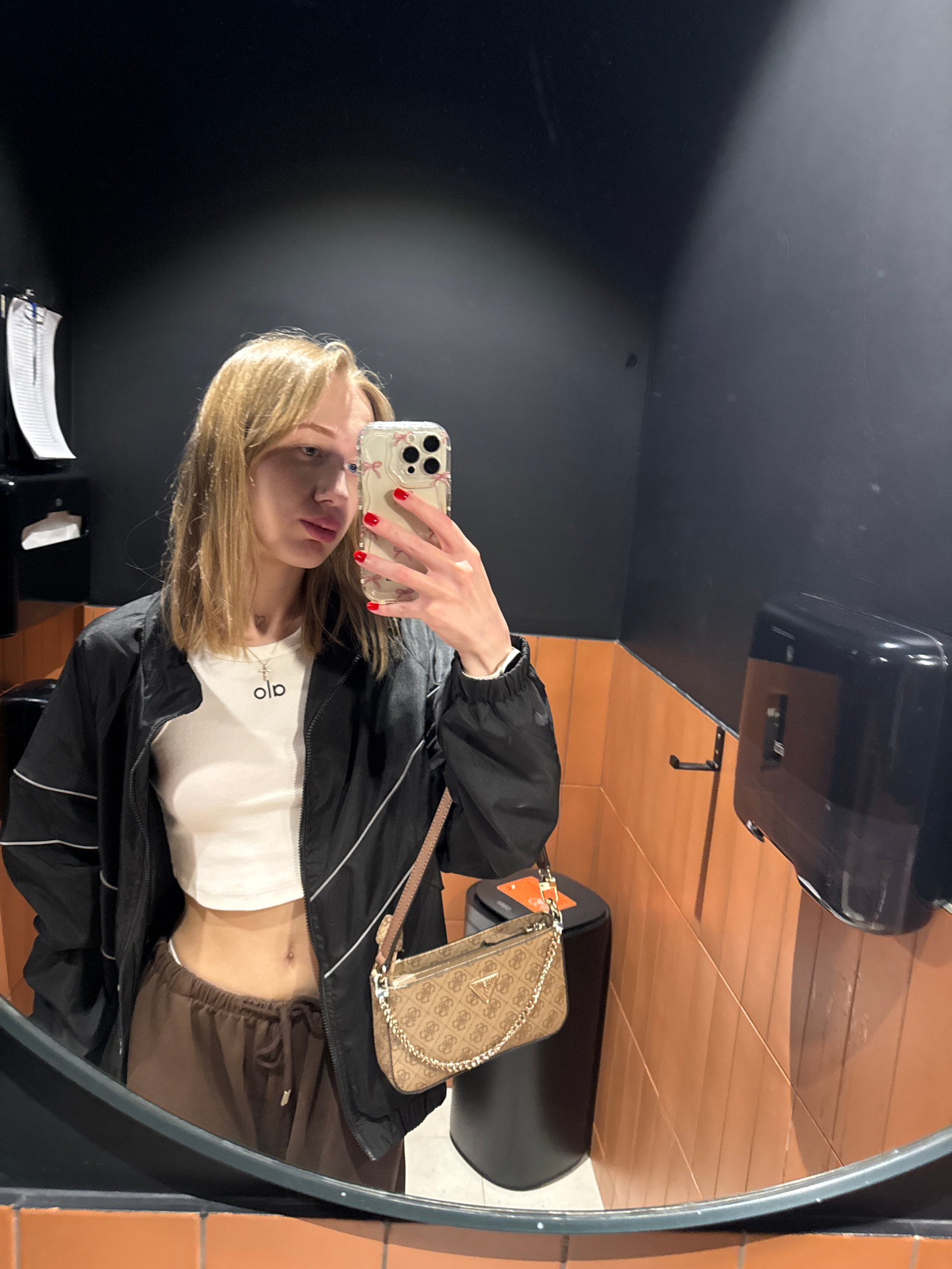 The image depicts a young woman taking a selfie in a restroom. She is wearing a white crop top with the word "alo" written in small letters, a black jacket with white accents, and brown sweatpants. He…read more