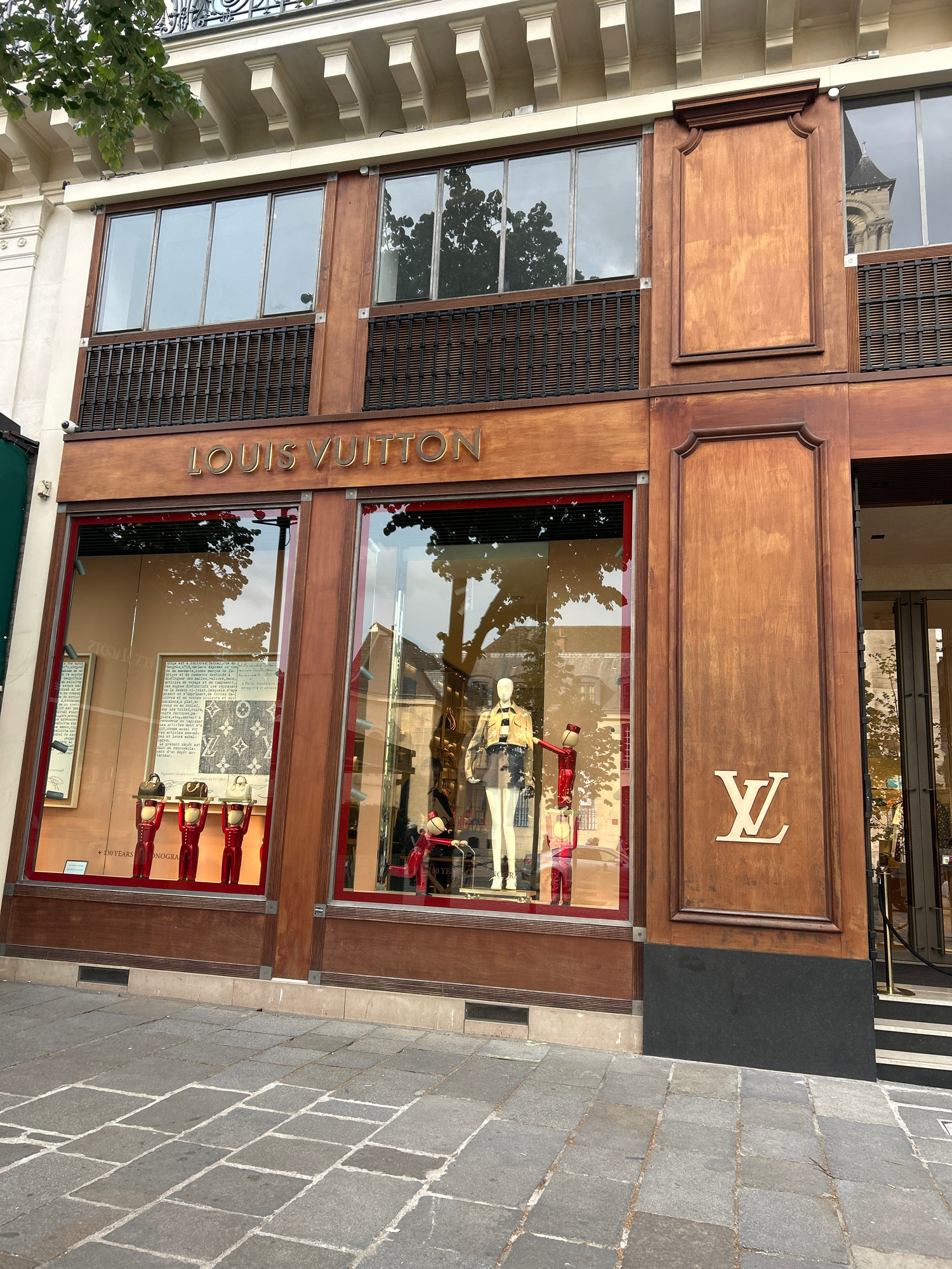 Here is a detailed description of the image: **Scene:** The image shows the storefront of a Louis Vuitton store. **Environment:** The store is located on a stone-paved street. The building exterior…read more