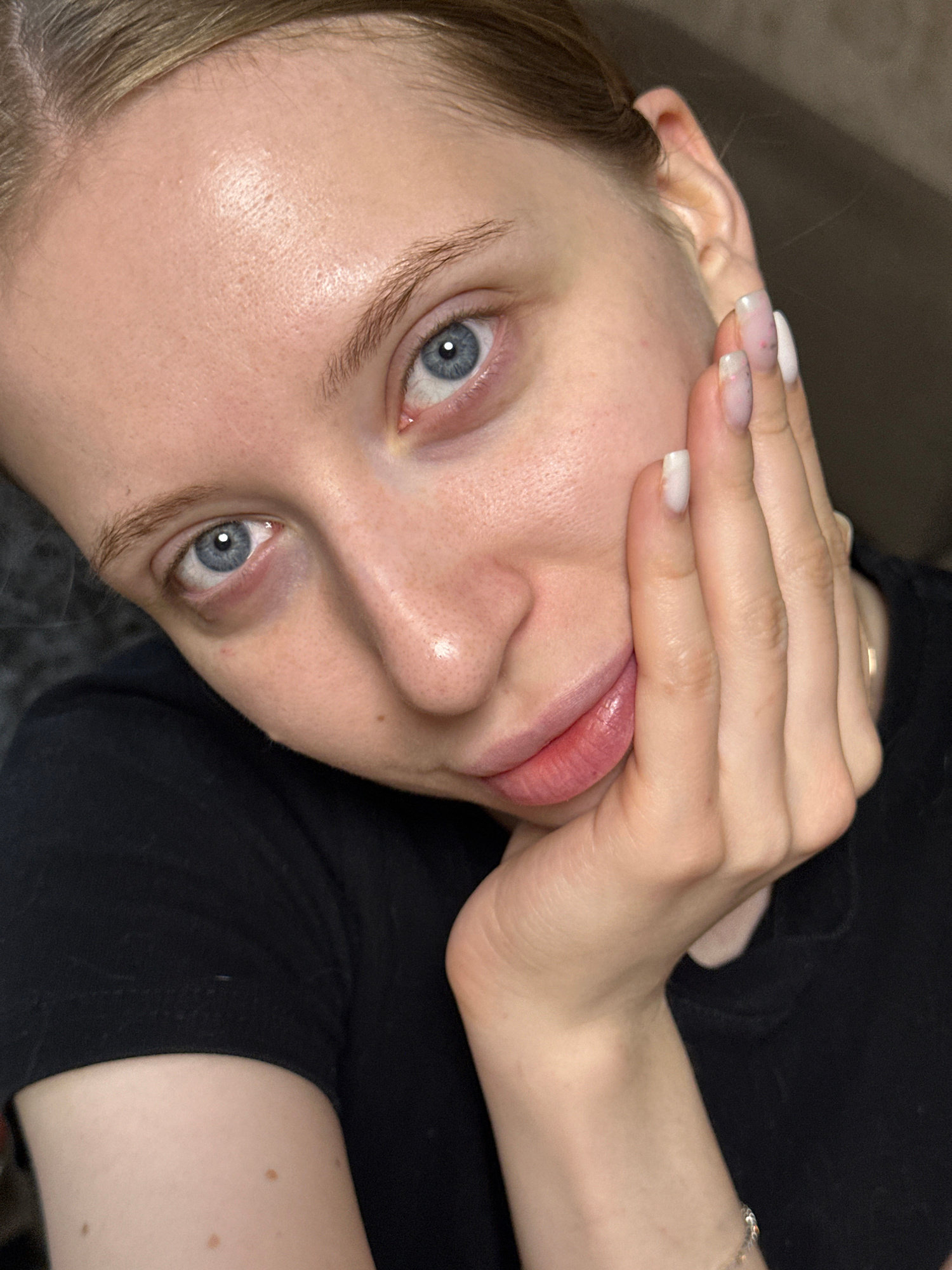 A close-up, angled selfie of a light-skinned woman with blue eyes. She is wearing a black shirt. Her right hand is partially covering her face, obscuring her forehead and cheek. The nails of that hand…read more