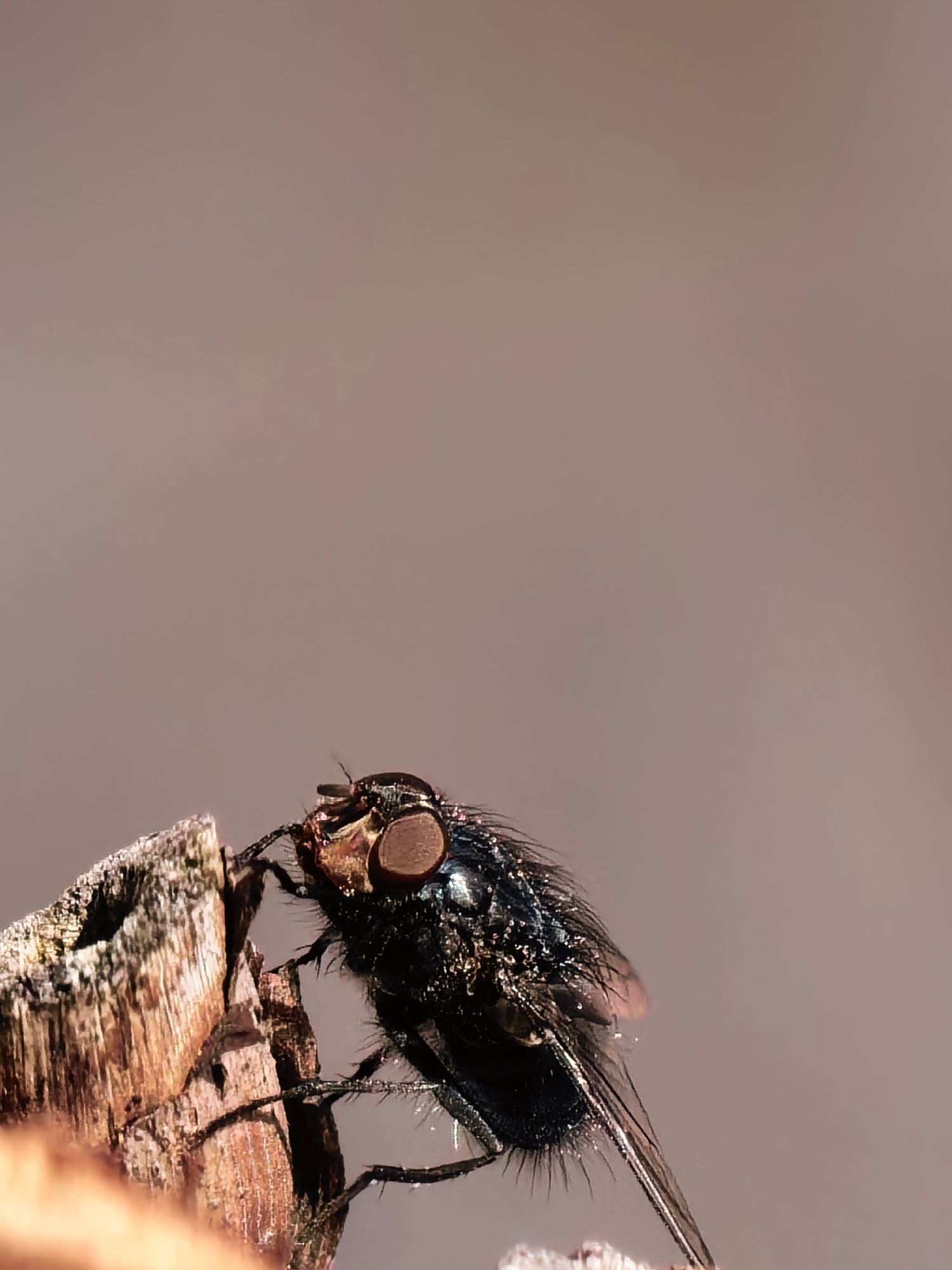A fly rests on a piece of wood. The background is a blurry light brown. The location is Unknown, Unknown.