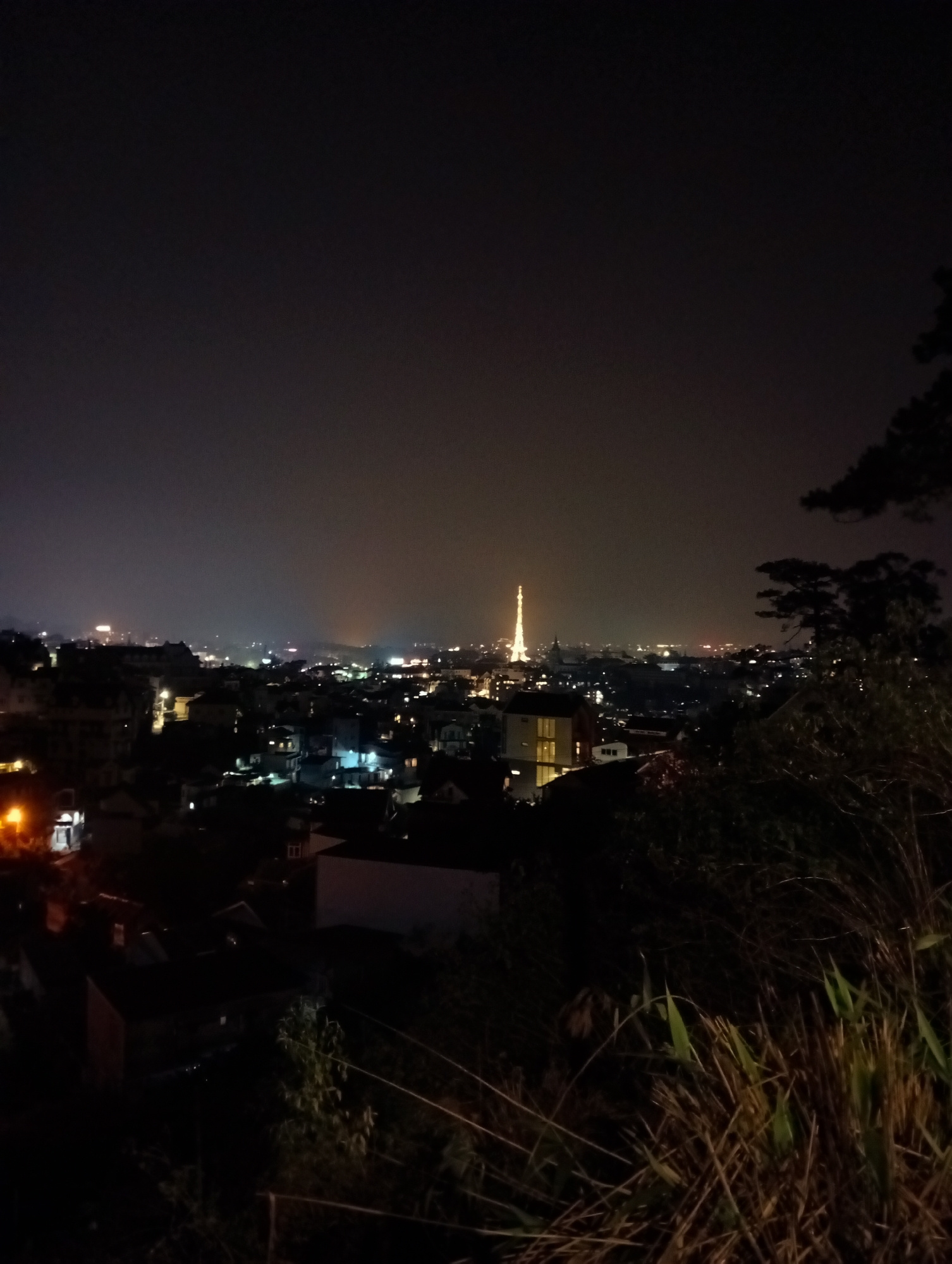 The image shows a nighttime view of Da Lat, Vietnam, with the prominent Thuy Ta Restaurant (often referred to as the "Eiffel Tower") illuminated in the center-right distance. The scene is captured fro…read more
