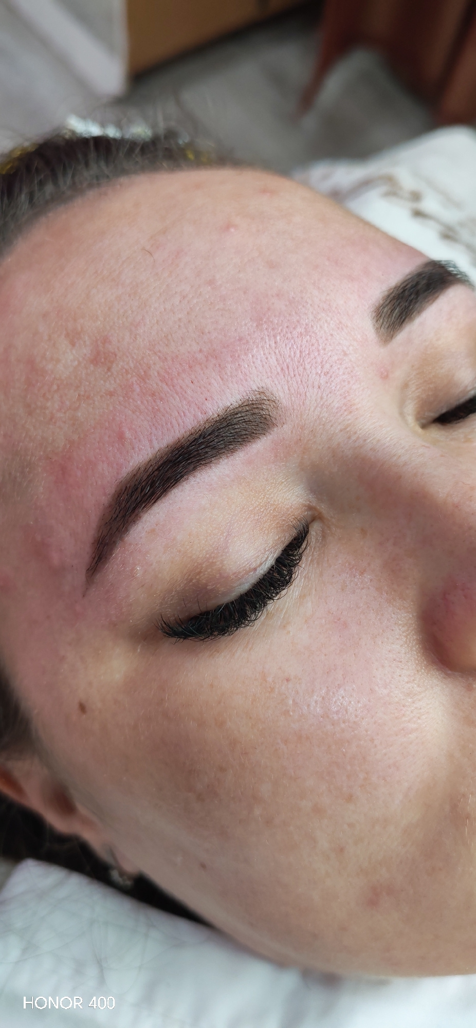 A close-up shot shows a person's face, likely a woman, with her eyes closed. Her eyebrows are well-defined and appear to be recently done or filled in. Eyelash extensions are visible on her upper eyel…read more