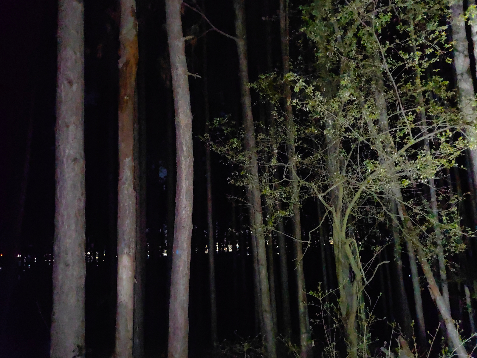 The image depicts a dark forest scene at night. The foreground is dominated by tall, vertical tree trunks. To the right, a smaller tree with sparse branches and foliage is illuminated. In the backgrou…read more