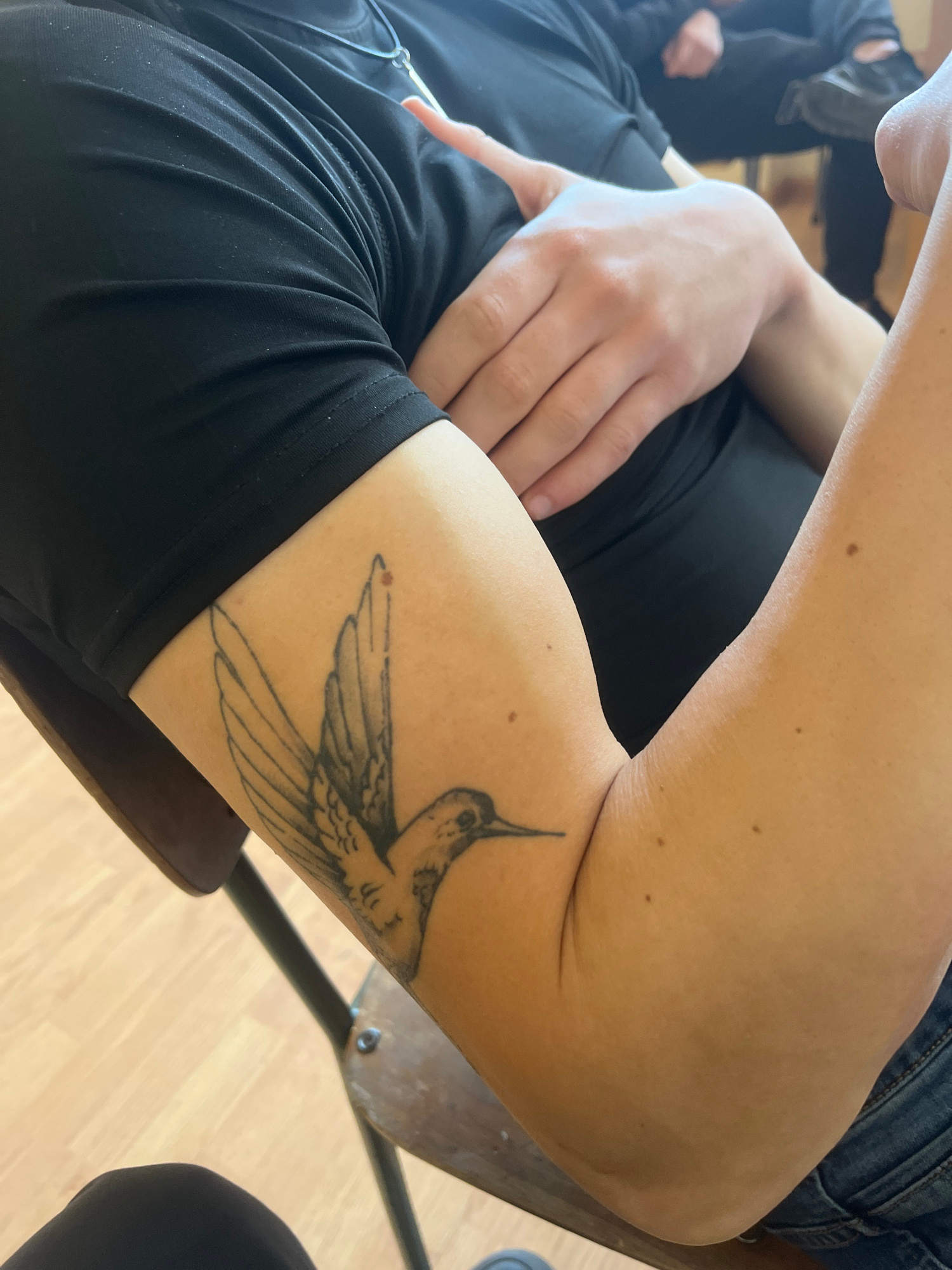 A close-up shot depicts a person seated on a wooden chair with a black garment draped over their lap. The individual has fair skin with several freckles or moles visible on their arm. The arm features…read more