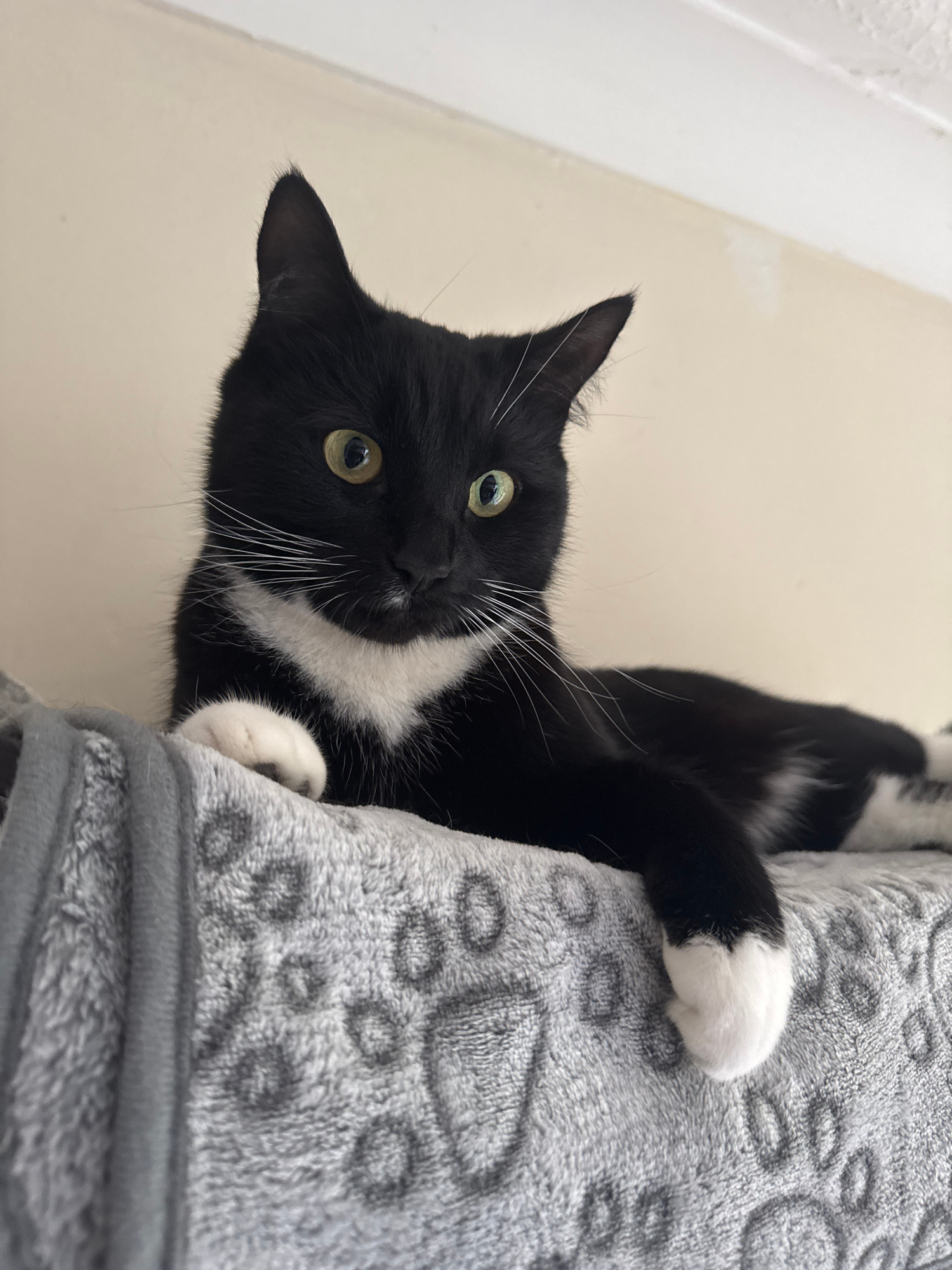A black and white tuxedo cat is clinging to a gray, plush blanket with a leopard-print pattern. The cat's head is oriented downwards, and it is looking directly at the viewer with yellow-green eyes an…read more