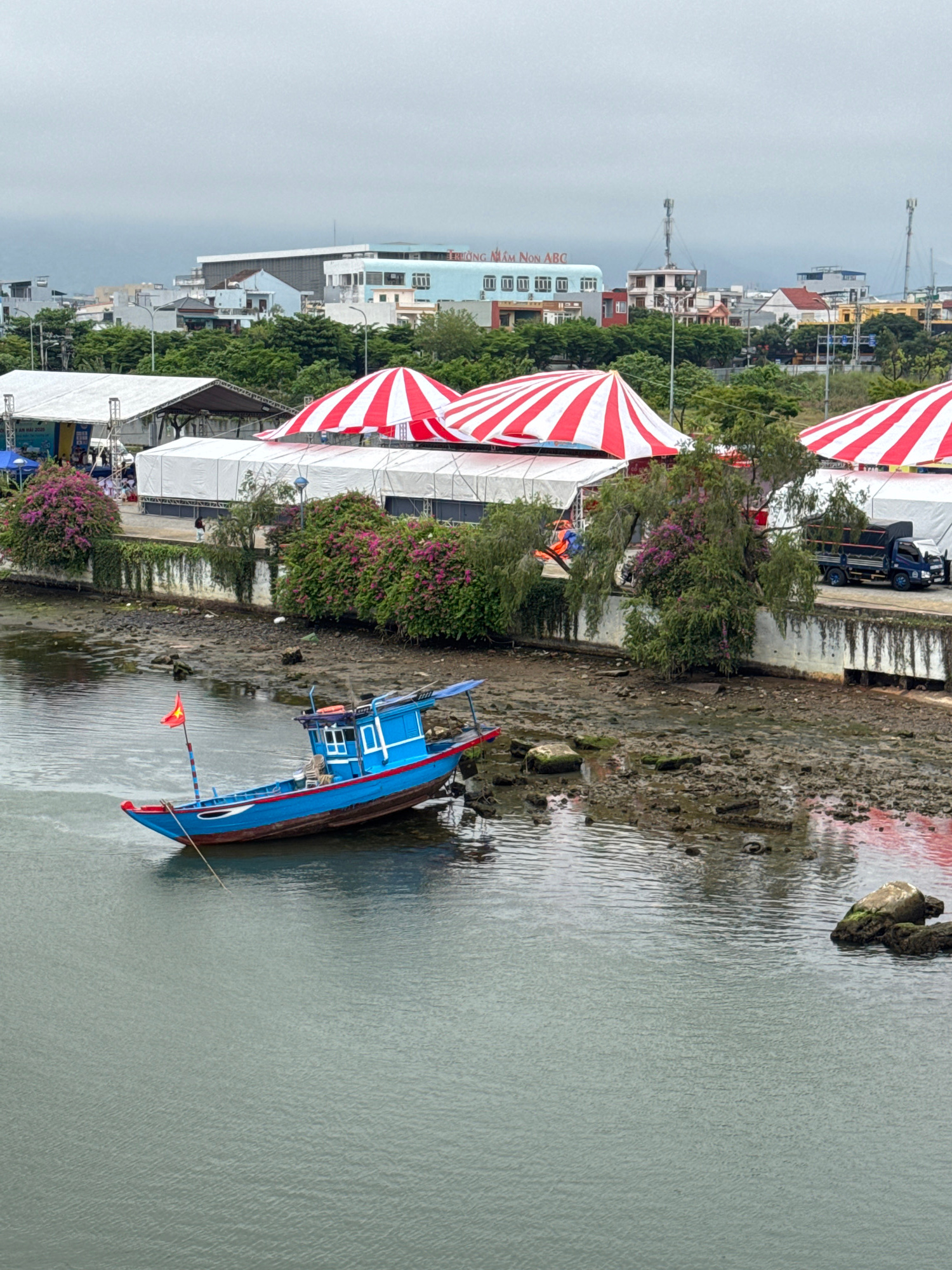A long shot shows a body of water, its bank, and tents adjacent to a building bearing the words "TRƯỜNG MẦM NON ABC," placing the scene in Đà Nẵng, Vietnam. A blue and red fishing boat, oriented from…read more