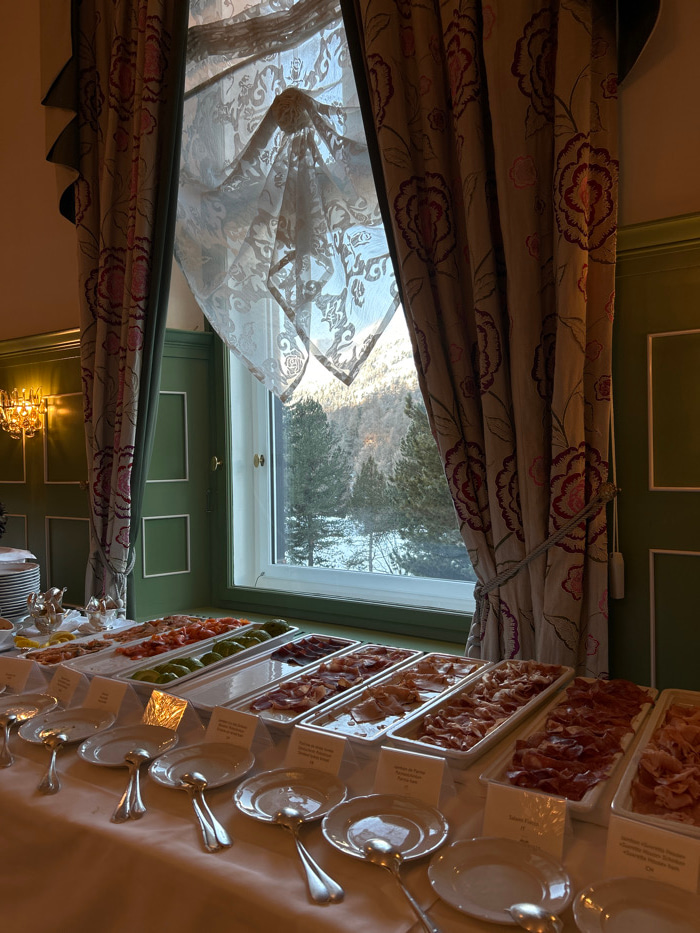 An indoor scene in Sankt Moritz, Switzerland, depicts a meticulously arranged buffet table set against a large window overlooking a snow-covered alpine landscape. The room features deep green paneled…read more