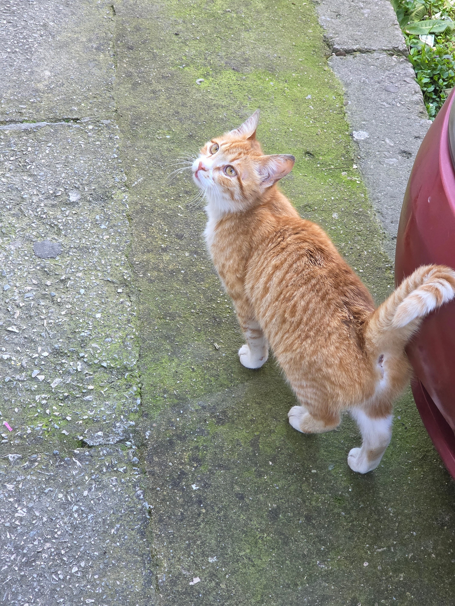 An orange and white tabby cat lies on a concrete surface, likely a sidewalk or driveway, partially obscured by a red object, possibly a car bumper. The concrete shows signs of wear and discoloration,…read more