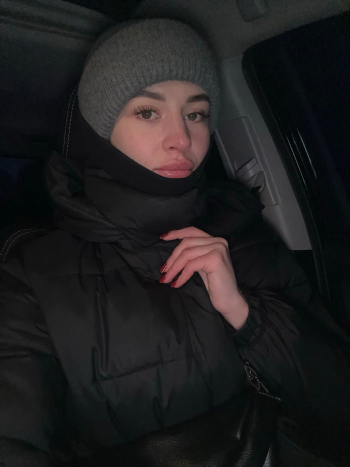 A person in a gray knit hat and black face covering is lying down in what appears to be a car or dark interior space. They are wearing a black puffer jacket and their pale hand, adorned with red nail…read more