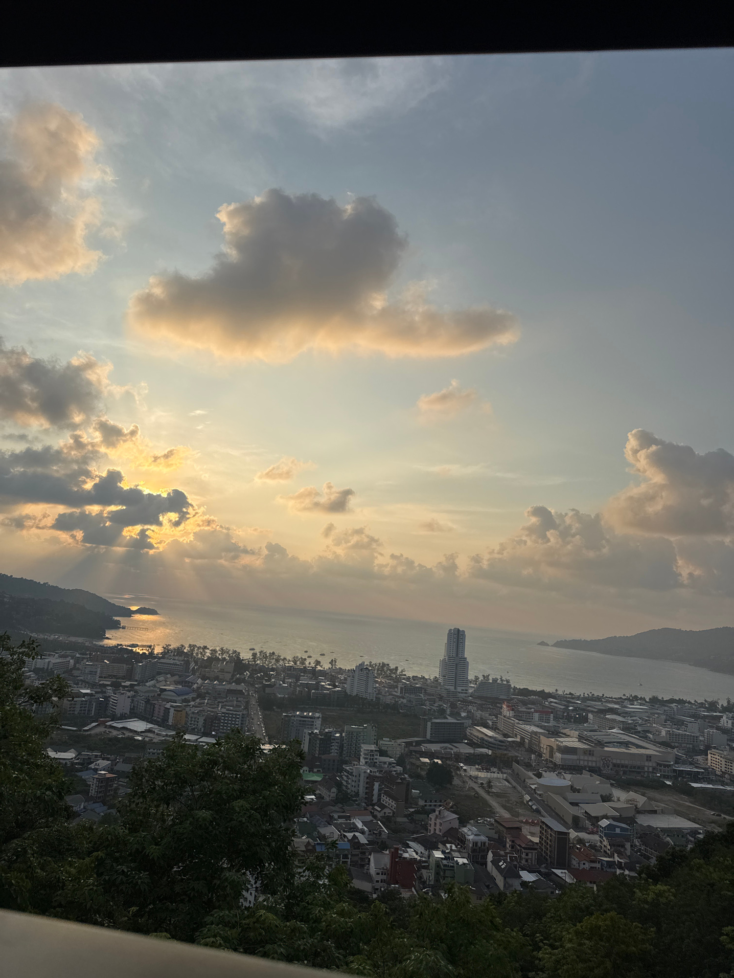 This media file presents a panoramic, vertically oriented view of a sprawling coastal city, identified as Patong, Thailand, captured during either sunrise or sunset. The perspective is from a high van…read more