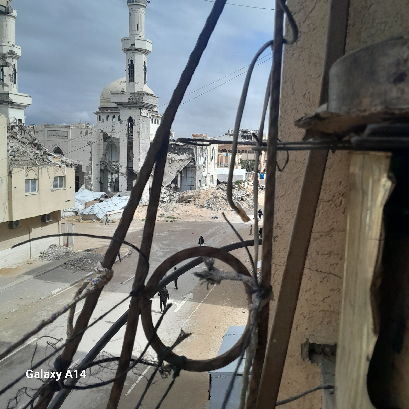The image, taken from an elevated perspective, shows extensive damage in what is identified as the city of Khan Yunis, Palestinian Territory. A partially destroyed mosque with a visible minaret is a k…read more
