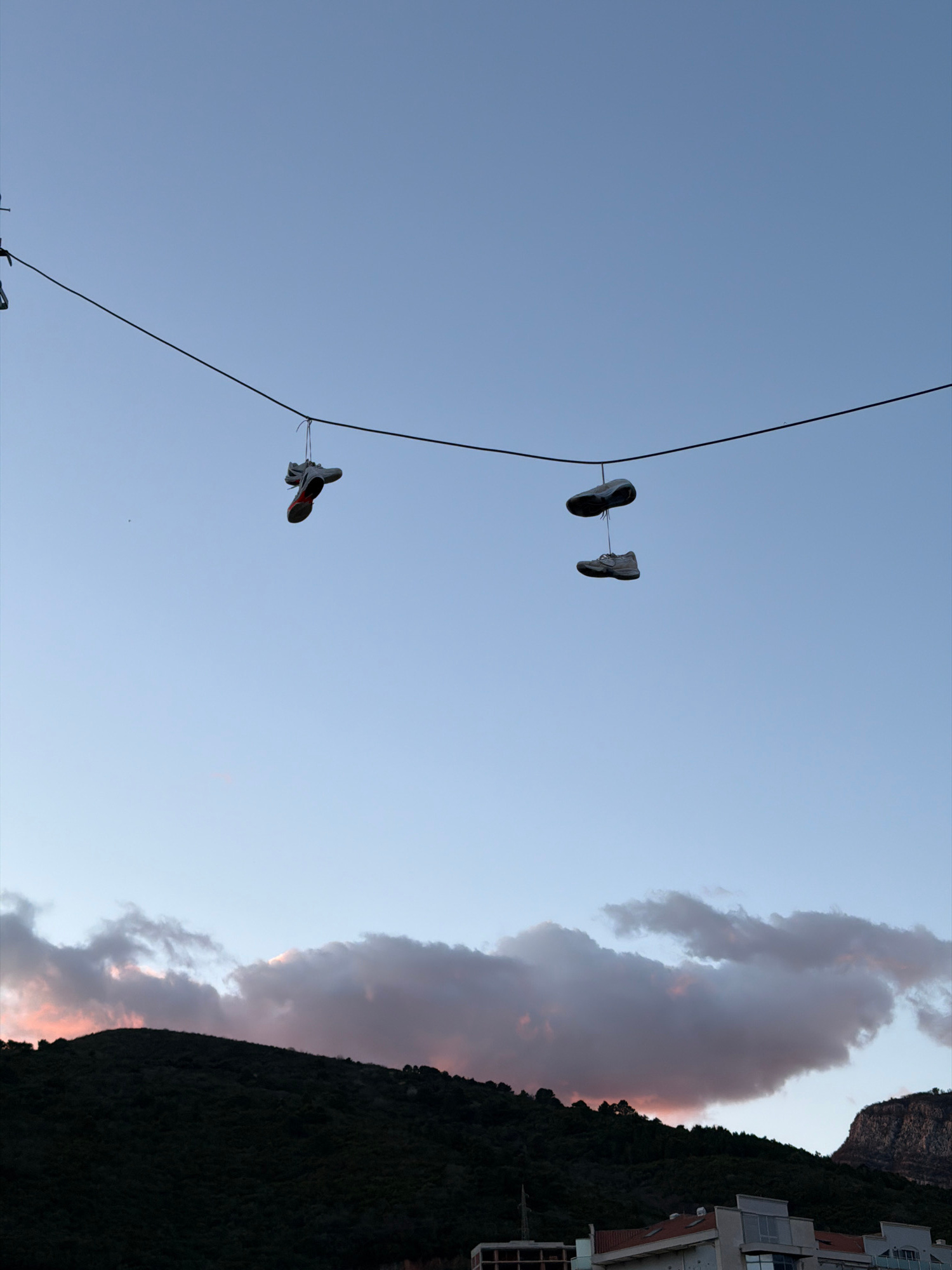 A low-angle shot shows two pairs of shoes hanging from a thin cable stretching across the sky, with a mountain and clouds in the background. The sky is a clear, pale blue. The shoes appear to be sneak…read more