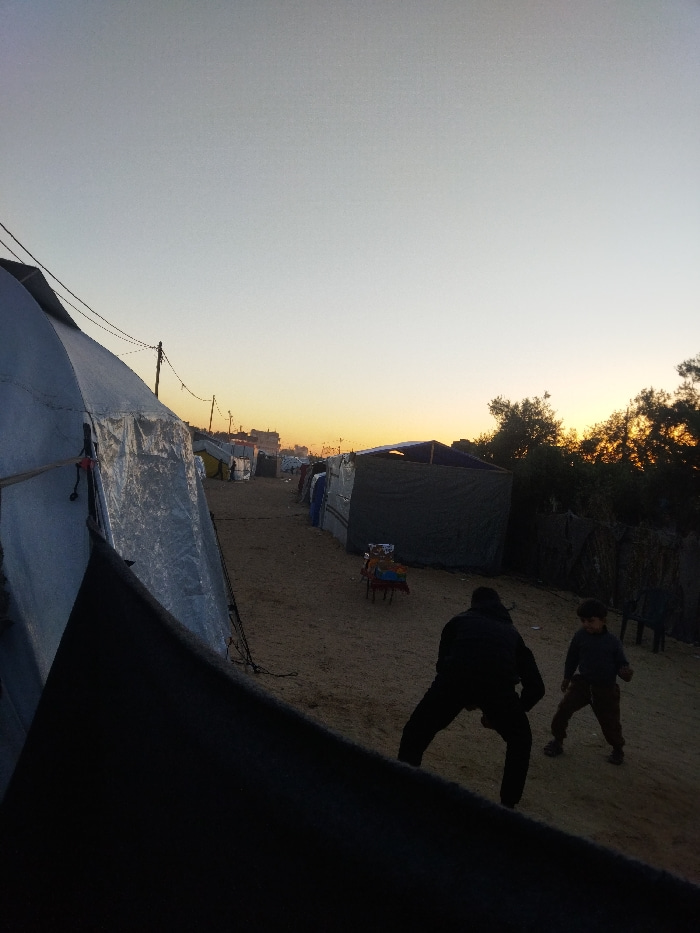 The image depicts an outdoor scene at dusk in Khan Yunis, Palestinian Territory. The sky displays a gradient from light grey overhead to an orange-yellow glow at the horizon, indicating sunset. A sand…read more