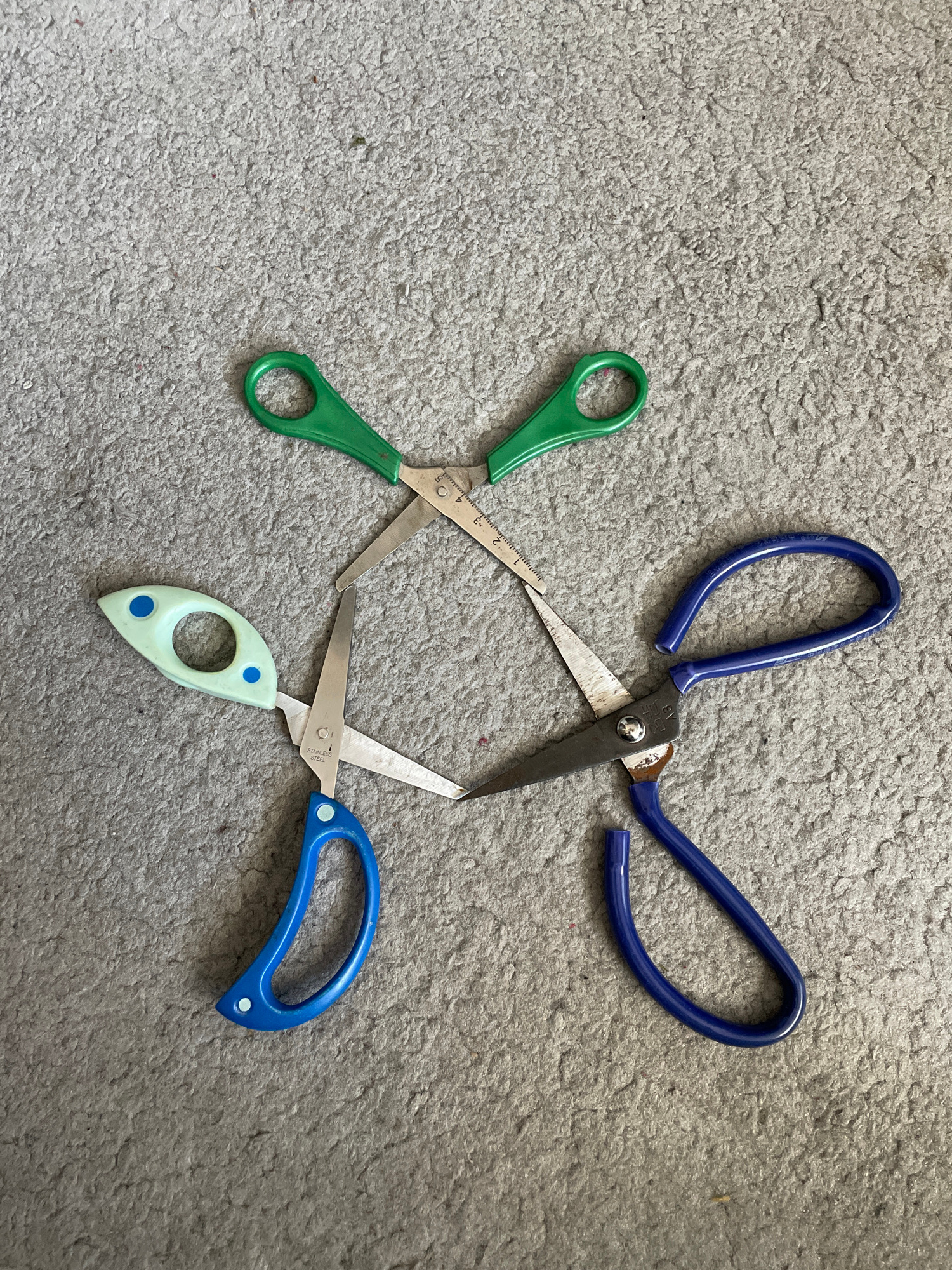 The image depicts three pairs of scissors arranged in a haphazard configuration on a gray carpet. The scissors have handles of blue, green, and light green with blue spots. The blades of the scissors…read more