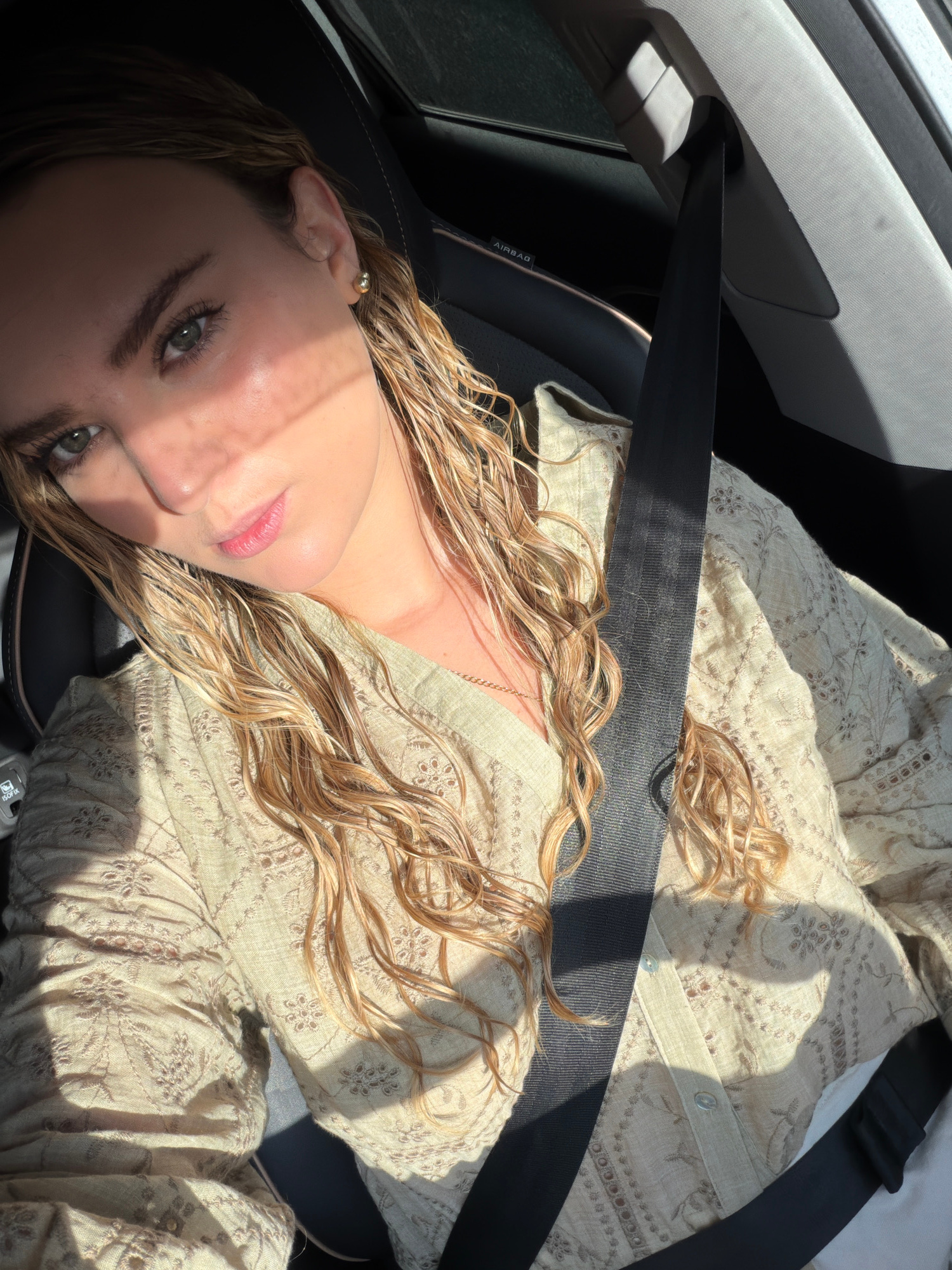 A woman with blonde, wavy hair is in a car. She is wearing a beige patterned shirt and has a black seatbelt across her chest. The environment appears to be the interior of a vehicle. There is an "AIRB…read more