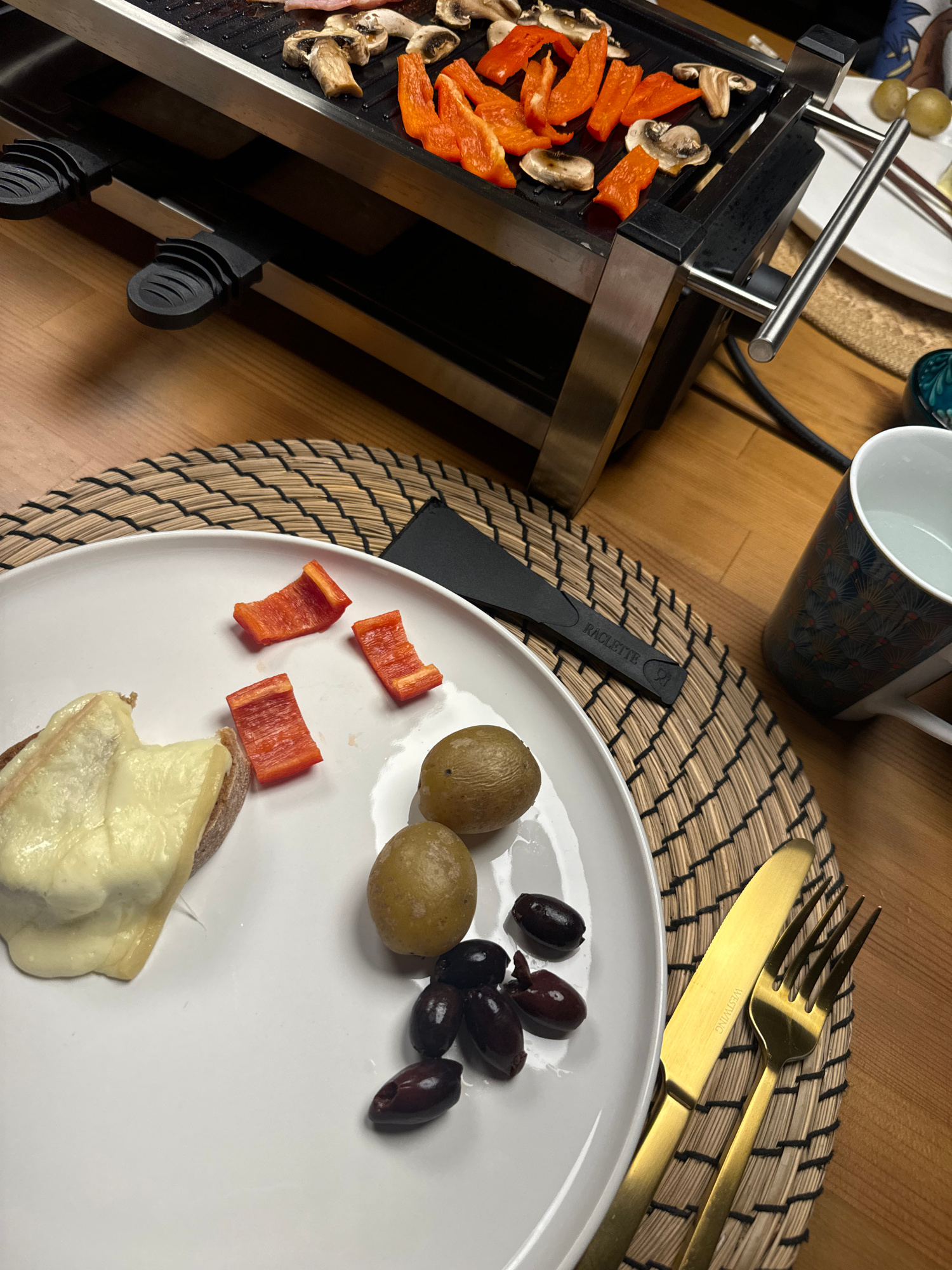 The image depicts a raclette meal setting on a wooden surface. A raclette grill is positioned to the left, with sliced mushrooms and red bell peppers on the grill surface. A white plate sits on a wove…read more