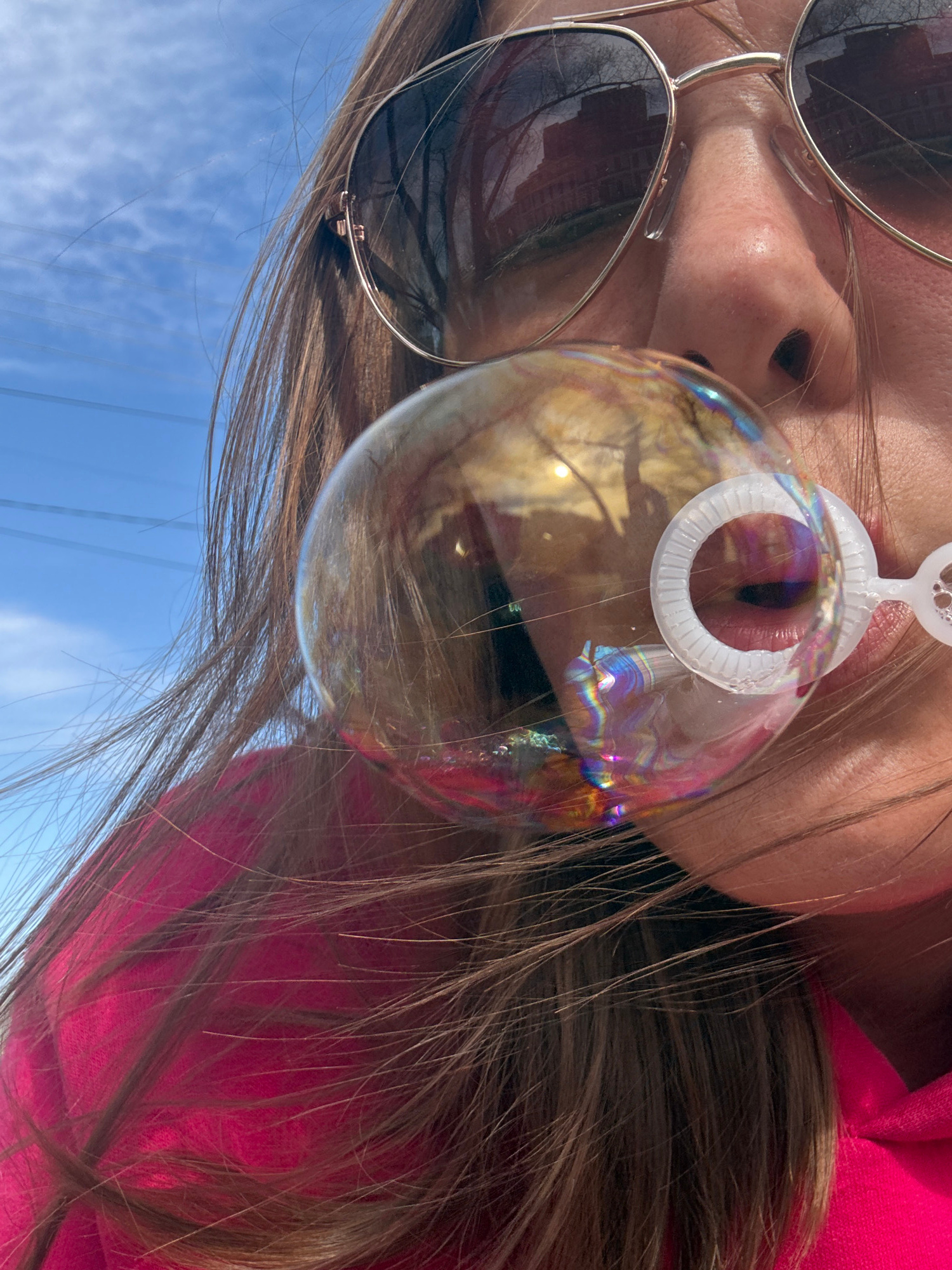 A low-angle, close-up shot depicts a person blowing a bubble. The person is wearing sunglasses. A pink hooded sweatshirt is also visible. The sky is blue with some clouds. Power lines are visible in t…read more