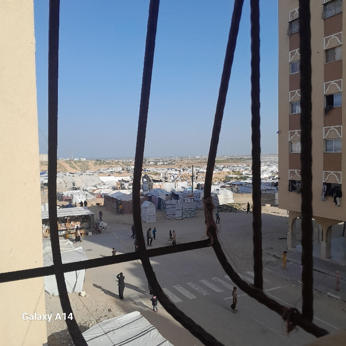 The view from a high window reveals a landscape of tents and temporary structures, possibly a refugee camp or settlement, stretching into the distance under a clear sky. A road with pedestrian crossin…read more