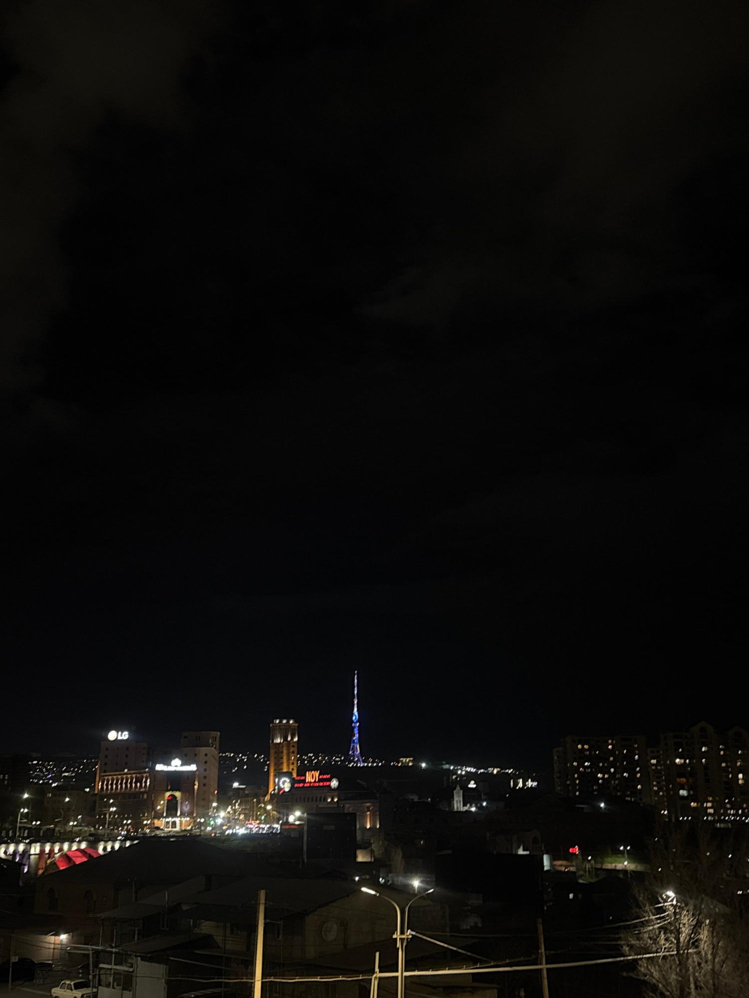The image shows a nighttime cityscape, likely taken from an elevated vantage point in Yerevan, Armenia. The prominent, illuminated tower in the center-right is the Yerevan TV Tower. Below it, illumina…read more