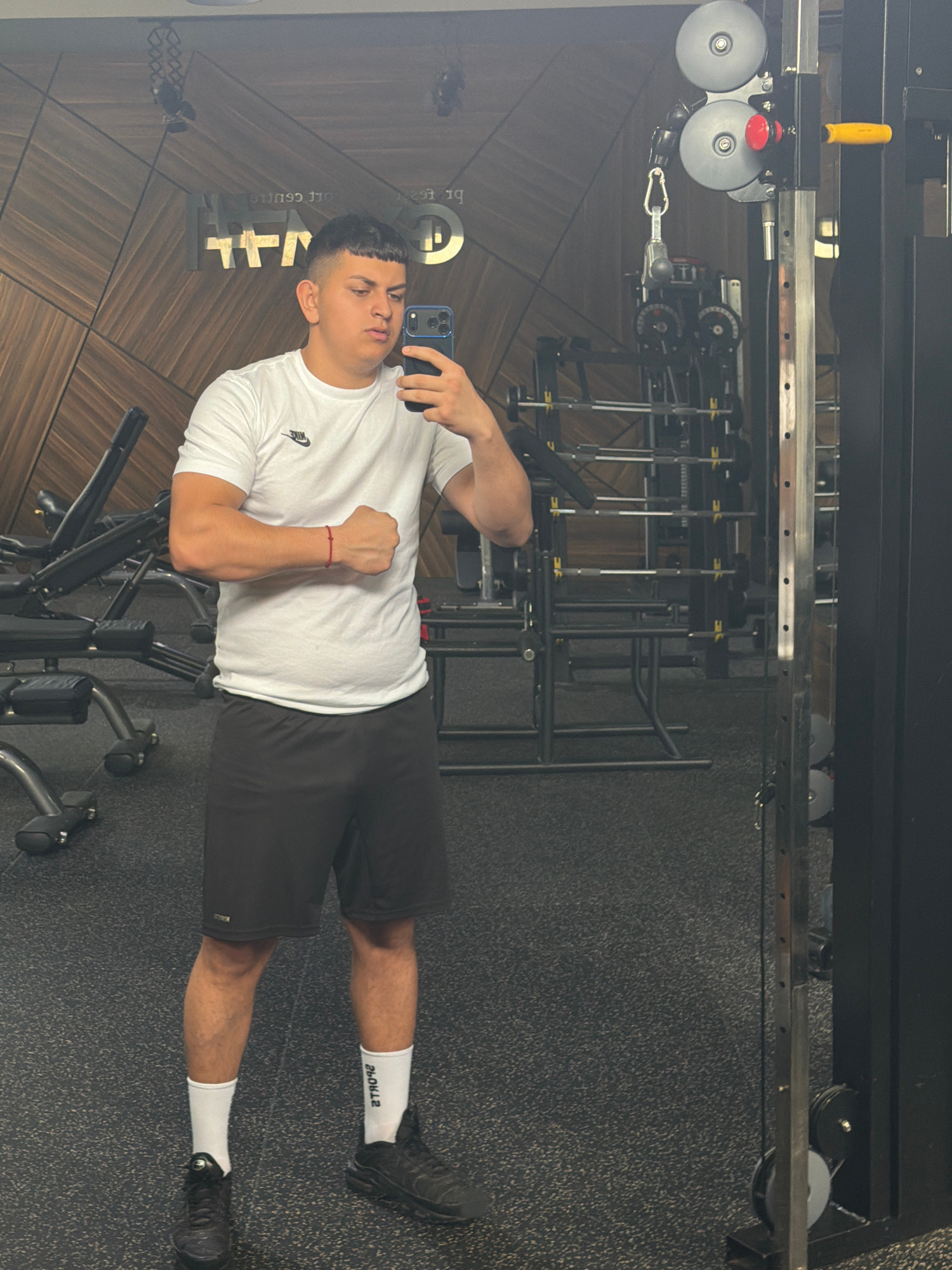 A young man takes a selfie at a gym. He is wearing a white t-shirt, black shorts, white socks, and black shoes. He is standing in front of a weight machine. The gym has a wood-paneled wall and a black…read more