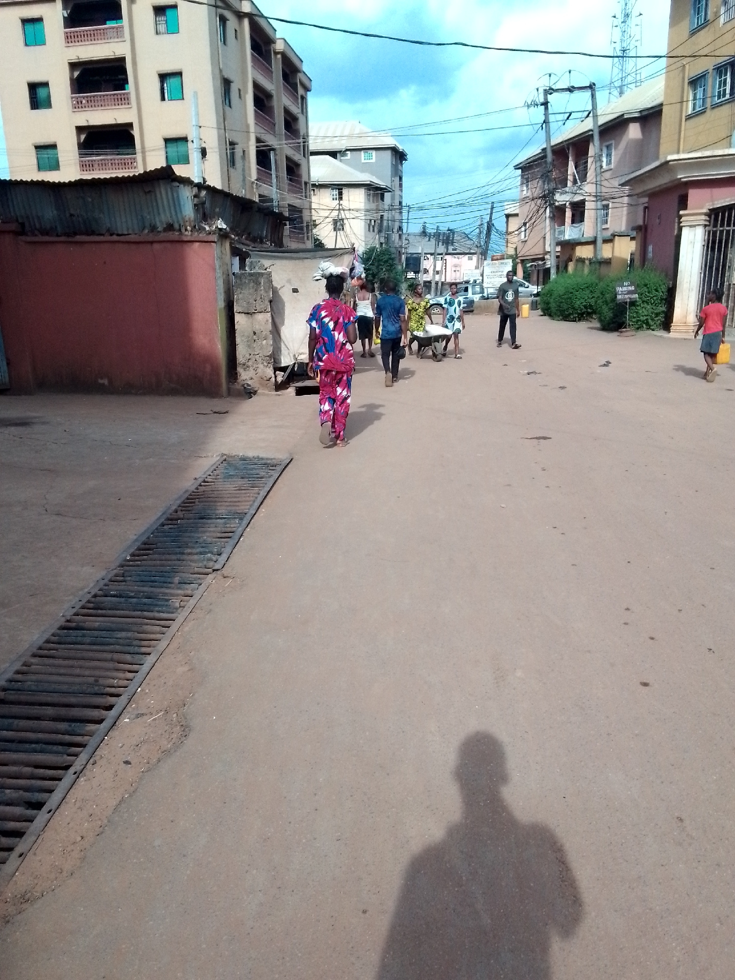 The image depicts a street scene in Onitsha, Nigeria. The street is paved, with a large metal drainage grate visible on the left side. Several people are walking along the street, some appearing to be…read more